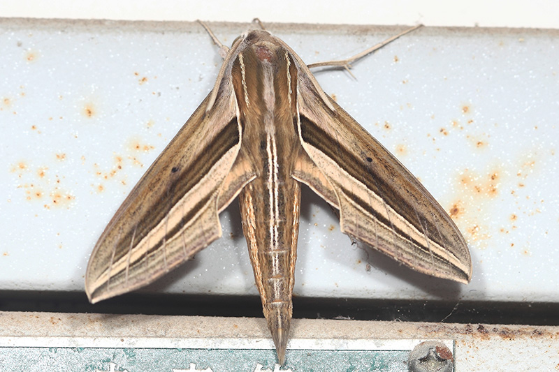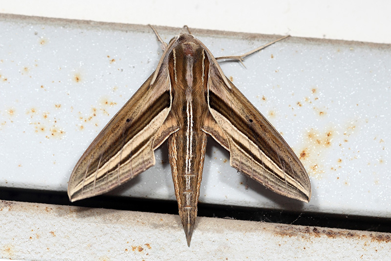 芋双线天蛾身体褐色,身体背后有两条白色线条,是名字中“双线”的来源。它翅顶角至后缘基部附近有一条较宽的浅黄褐色斜带,斜带内外有数条黑、白色条纹,配色严谨。它身体呈流线型,双翅后倾,酷似一架高空高速战斗机,一看就知道它飞行性能十分了得。芋双线天蛾多为夜间活动,飞翔能力极强。它的娃主要吃芋头或其它天南星科植物叶子,但由于数量不多,所以危害不大,这也是它的名字上有“芋”字的原因。