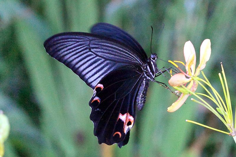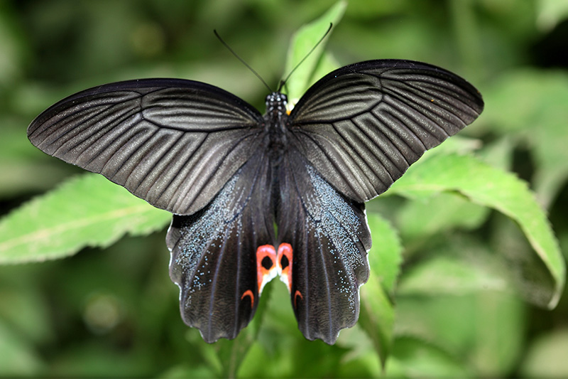 蓝凤蝶又名乌凤蝶,是常见的大型蝶类,翅展95-120毫米。它名为蓝凤蝶,其实颜色偏黑,某些角度才能泛出一些蓝光,使得直观上看到身体和翅呈黑蓝色。蓝凤蝶翅膀上的鳞片细腻而有光泽,有靛蓝色天鹅绒的质感。雄蝶体型较大,前翅无斑纹,后翅有带红环的黑斑,雌蝶体型娇小,后翅弧形红斑比雄蝶发达。蓝凤蝶是果园的害虫,其幼虫主要危害柑橘类果树的幼叶,在啃食柑橘叶片过程中,将柑橘叶片腺点内的物质收集在臭腺角内,转化成能挥发的刺激性气味,用以自保,属于柑橘园中的主要害虫。