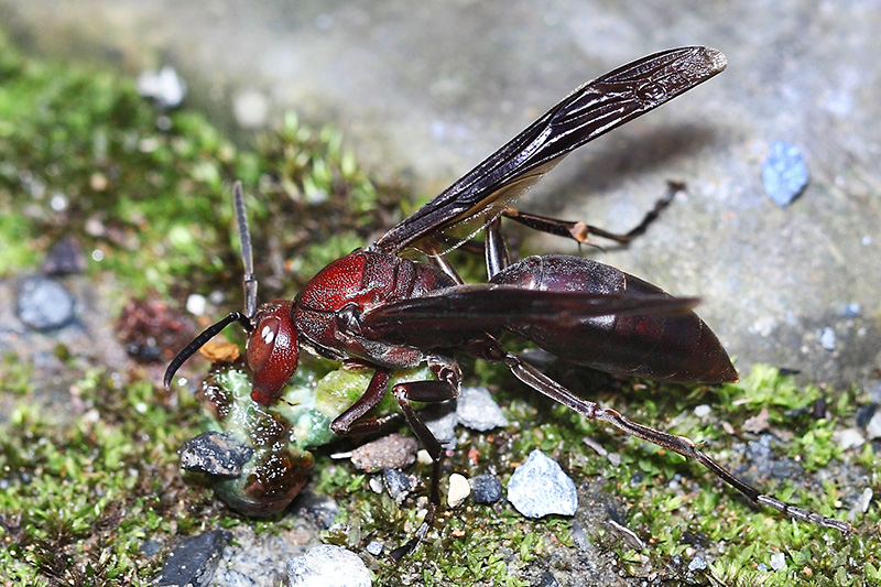 棕马蜂身形壮硕,威武如虎,体型是仅次于中华虎头蜂的巨型马蜂。它触角黑色,体色红褐色具强烈光泽,雌蜂体型稍小,体长约30毫米,雄蜂体形较大,约38毫米。它翅膀强健,飞行时犹如轰炸机一般声音很大,震得你头皮发麻。棕马蜂是肉食性昆虫,能吃掉很多对农业有害的昆虫,有时也食用花粉、蜜露等。它们食性广、捕食迅速、捕食量大,所以可以用于生态防治。棕马蜂喜欢在避雨处筑巢繁殖后代,它的巢像一个倒扣的莲蓬,很容易辨认。棕马蜂也具有用于防御的螯针,螯针粗大,长达6毫米,是令人生畏的武器。攻击时注入毒液同时释放信息素召唤其他同伴前来支援,这家伙瞬间就变成了一个可以连续追击的刺客