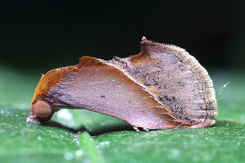 升夜蛾是一种怎么看都不像动物的夜蛾。它喜欢停在叶片的背面,全身红褐色,足和触角收拢在身下,像一块枯叶的碎片,外形几乎与任何蛾子都不像,哪端是头部都不容易区分,甚至轻微触碰也不飞走,真是蛾界的拟态高手,难以被天敌发现。这种视而难辨的手段使得它几乎破除自然法则,轻易地混到了今天。 分类:昆虫纲 鳞翅目 夜蛾科 图像采集地:广西药用植物园