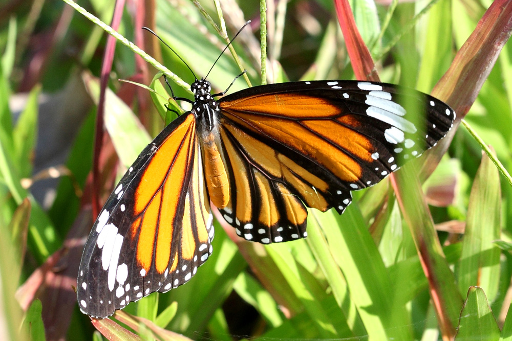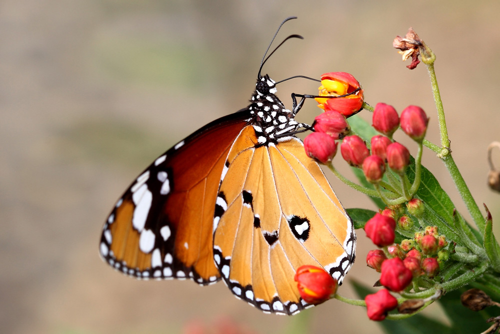 右图),很易识别。金斑蝶幼虫常吃有毒植物而含有毒素,可减少天敌伤害。虎斑蝶分布于非洲和亚洲,也是本地常见蝶类。虎斑蝶与金斑蝶同科同属,斑纹配色很相似,最大的区别是虎斑蝶的翅上有贯穿翅的黑色条伩。虎斑蝶分布于我国两广、海南、四川等地,是优良的工艺、观赏蝶种。
