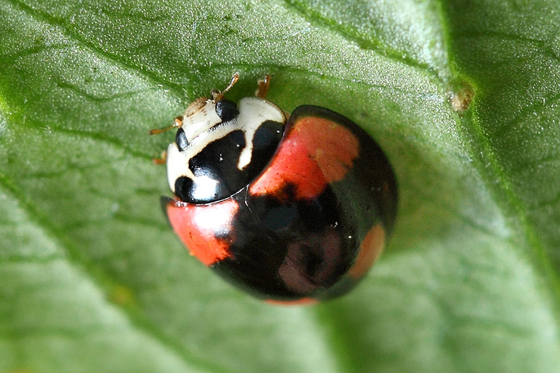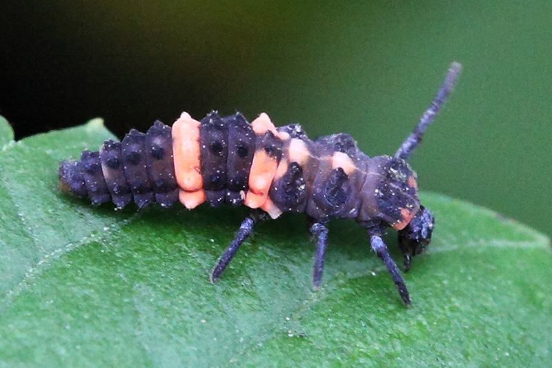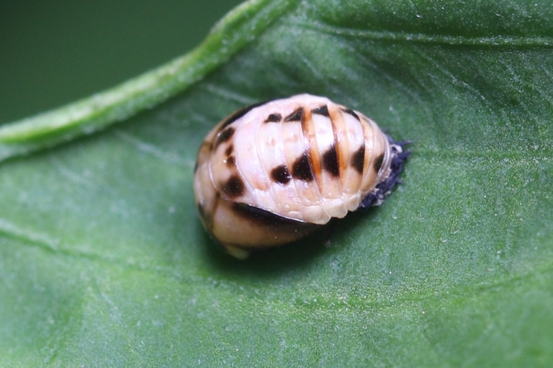六斑月瓢虫又叫六条瓢虫,半球形,橙色,正常斑型是左右各三条黑色横斑,共六条。但斑型变异很多,据说超过20种。六斑月瓢虫成虫和幼虫都会取食蚜虫和木虱,幼虫体色黑色,体背中央有白色纵斑,是分布极普遍的食蚜性瓢虫。六斑月瓢虫是本地数量最多,分布最广的瓢虫。在南宁市市区和远郊,几乎是只要有绿地就有它的身影。