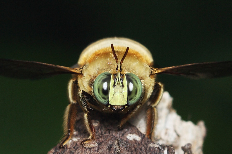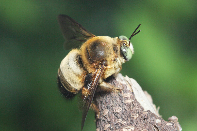 突眼木蜂是一种中型蜂类,这家伙身体粗短,显得胖乎乎的,全身披着黄色和棕黄色的绒毛,就像一只绒毛玩具。特别突出的是它的那一对大大的眼睛,加之额头有一块黄色的方形面板,像极了京剧里的丑角扮相,十分滑稽。原谅我眼界有限,这是目前我在昆虫界见到的最纯良、最清澈、最呆萌、眼神最游离的眼睛,没有之一。突眼木蜂飞行并不灵活,飞行路线较凌乱,不时还撞到树上,笨头笨脑的,十分可爱。突眼木蜂是蜂类家族中最萌的一只。