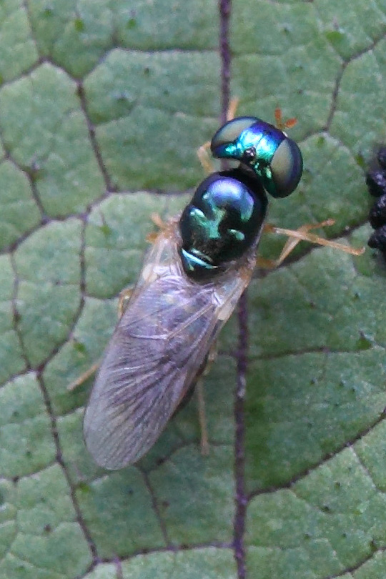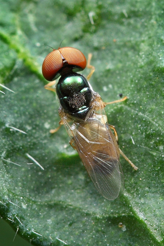 黄腹小丽水虻体长只有5毫米,在昆虫界算是一种常见的小而美的虫子了,在摄影界也是属于那种性情稳定,很配合拍照的好模特。它自带两只超大的大眼睛(复眼)外,还自备似笑非笑的表情包(胸背),自修的发髻(头)也很潮,飞行时还自发彩虹(翅)。你以为这就完了吗?它居然还很贴心的提供红(雄)、蓝(雌)两个款式以供观赏,还是免费的。由于体型过于微小,在野外除了发现它需要较好的眼力外,剩下的就是你按快门的声音了。