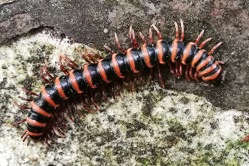 粗略一看很眼熟,它有好多细细的小腿,又是一条蜈蚣?长相确实有点像,但又没有蜈蚣跑得快,还穿着斑马衣,它就是红条奇马陆。它是蜈蚣吗?非也。它和蜈蚣同属于多足类,但亲缘关系还有点远,并不是蜈蚣。红条奇马陆体长约3厘米,它的身上有红黑相间的条纹,色彩特别醒目,也更有警戒性。但它没有毒牙,遇到外界刺激的时候只能分泌一些有臭味的液体,希望吓走敌人,或者把自己缩成一团,以求自保。这种马陆春夏秋三季可见,它喜欢阴暗潮湿的环境,一般生活在室外的枯枝落叶堆或者草丛中,吃腐烂的植物,对人无害。