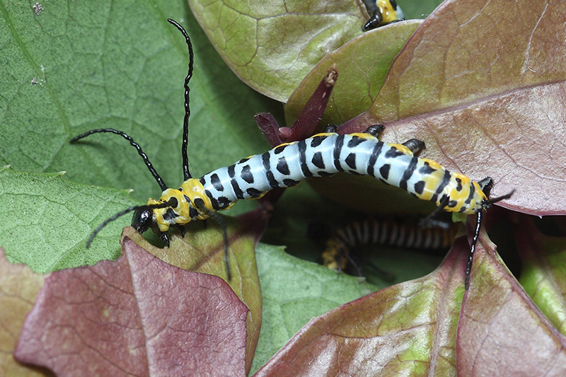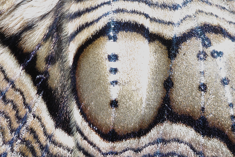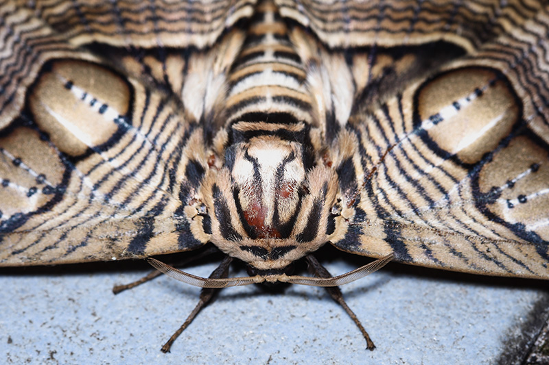 青球箩纹蛾是一种长着魔幻般花纹的蛾子,翅展超过15厘米,体长超过5厘米,是真正的大蛾子。成虫体青褐色,带有明显的青铜色,翅的花纹奇异,犹如竹编箩筐的纹路,极富质感。双翅上有两只有魔力的大眼睛,加上不同的纹理合到一起,乍一看像极了某些幻觉动物的面颊,不怒自威,是一只真正的幺蛾子。它的娃也同样魔幻,幼虫身体黄黑蓝配色夸张,极像蟒蛇的蛇皮纹理。它头部有四根、尾部有三根黑色的长肉突,随时都在四处挥舞,张牙舞爪,看到它不信你心里不凉飕飕的,不过大可不必担心,它没毒。本人在大明山得到过一只雌性的青球箩纹蛾,它产下的40多枚卵孵化出了9只幼虫,在饲养的过程中投放木樨科植物桂花的嫩叶喂养,用喷壶喷雾保湿,看着它一天天长大非常开心。就在幼虫第一次蜕皮后的第三天,它们突然全都死亡了,查找原因是喂食了附近公园里喷有农药的桂花叶。那几天心情真的不好,因为这货的末龄幼虫真的能长到13厘米以上,想想那大虫乱爬的场景,一定很壮观!唉,下次吧。