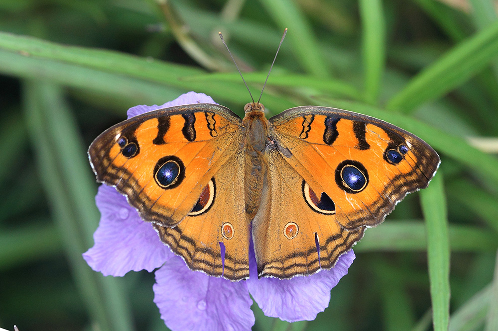 美眼蛱蝶也被称为猫眼蛱蝶、孔雀眼蛱蝶。要说颜值高的蝴蝶,美眼蛱蝶绝对算上是其中一个,尤其是后翅正面上的那对“眼睛”,真是又大又漂亮!后翅的“眼”斑具有黑色眼眶、黄色眼圈、红色眼仁、黑色瞳孔,甚至还有两个表示眼光的白点,仿佛真正的眼珠。用放大镜仔细观察,你会发现每一只美眼蛱蝶的“眼”都是不一样的,都是独一无二的,这种独特性也是大自然的奇妙