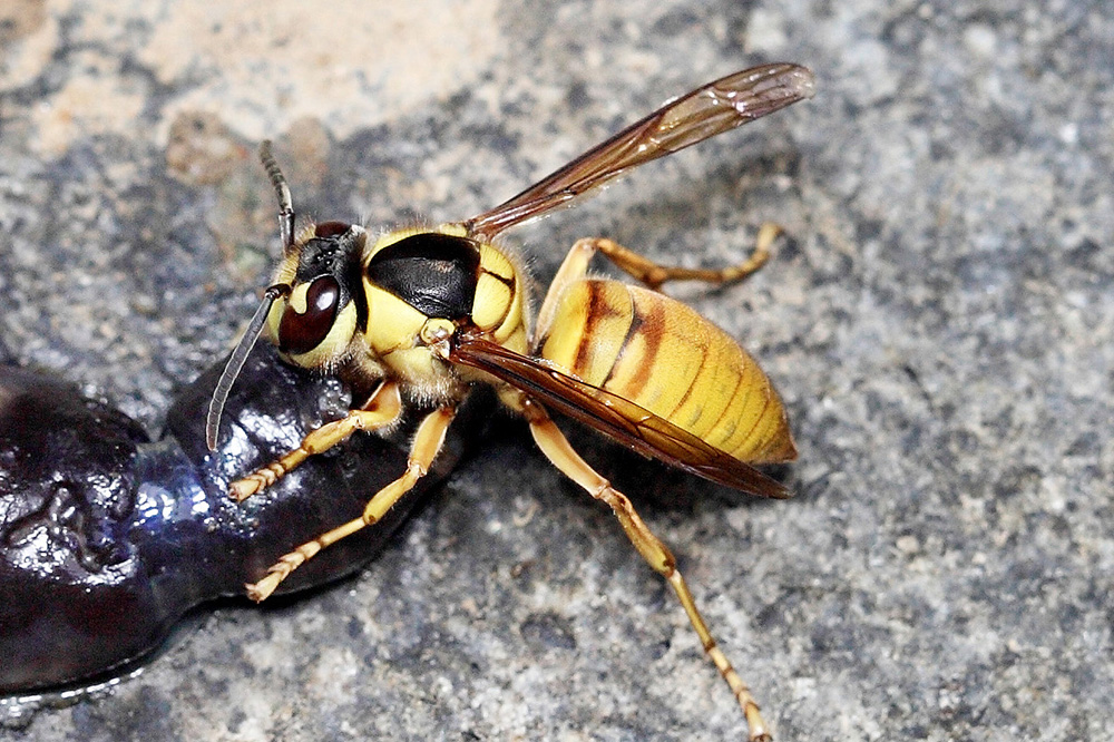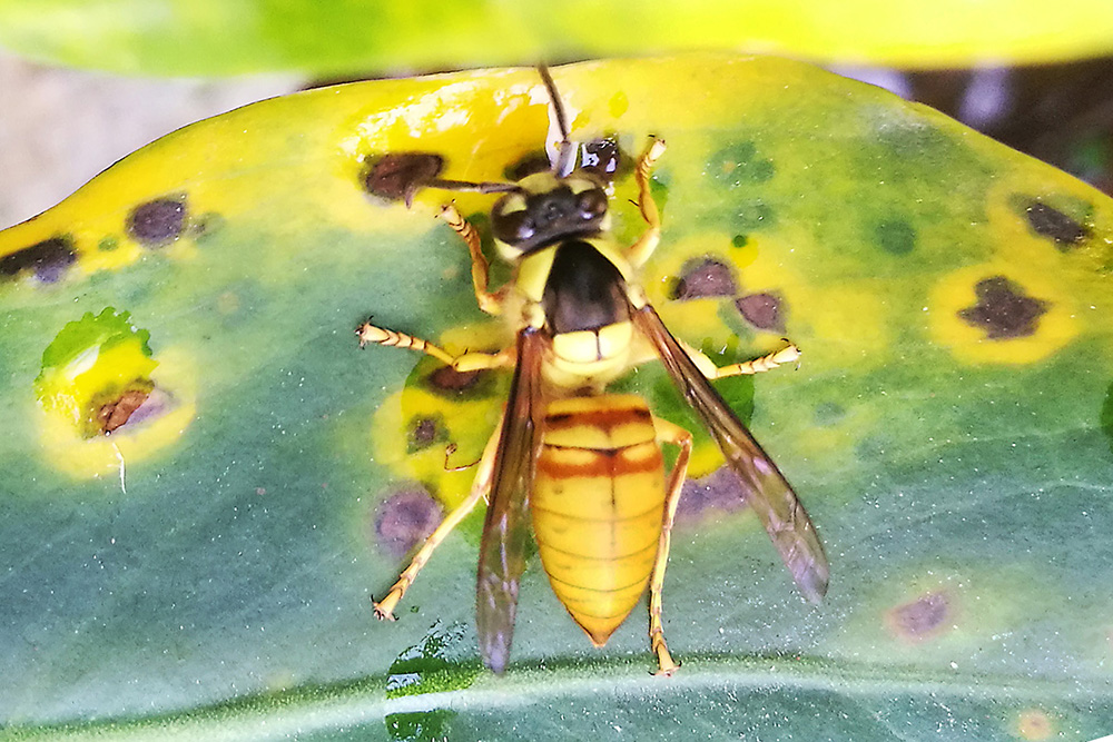 这是一位身黑背盾牌的黄色刺客,黑盾胡蜂身体大部分呈黄色,体长约21毫米。它头部的额与颅顶黑色,有棕色长毛,最显眼的是它的胸背部有一个三角形的黑色区域,像背着一个黑色盾牌,因而得此大名。黑盾胡蜂虽然也喜访花吸蜜,但花蜜只是零食,主食还是肉。它愿意花更多的时间在农田、荒野巡游,特别喜欢捕食粘虫、玉米螟、菜青虫等害虫,有时还捕食蜜蜂,是农田中的益虫。黑盾胡蜂喜欢在地面或树洞中筑巢,蜂巢近圆形或梨形,最大可达10公斤以上,现在已经有人进行人工饲养以获取其蜂蛹。黑盾胡蜂是个不好惹的家伙,虽然它的毒性不大,在大型胡蜂中排名靠后,但它仍属于危险的蜂类,被其蜇伤其严重后果也是不容忽视的。单独巡游的黑盾胡蜂没有太大的攻击性,但触碰它的蜂巢就不一样了,因此若无必要不要去它家家访,尽量远离它的蜂巢。