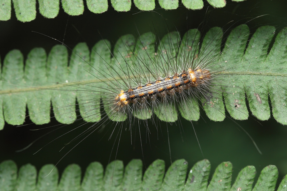 猩红雪苔蛾常在台湾相思树上产卵,幼虫在树下的草丛中生活。幼虫在生长过程中,一部分的硬毛长得很长(图一),显示出一副不可侵犯的样子。即将化蛹时,猩红雪苔蛾幼虫把自己身上的长硬毛拔下来,用它在自己身体的外面编织成一个精致的“笼子”(图二),安心在里面慢慢地发育化蛹(图三),最终羽化出美丽的成虫(图四)。用自己的毛编织成茧,在昆虫界的确比较罕见!