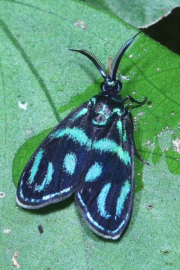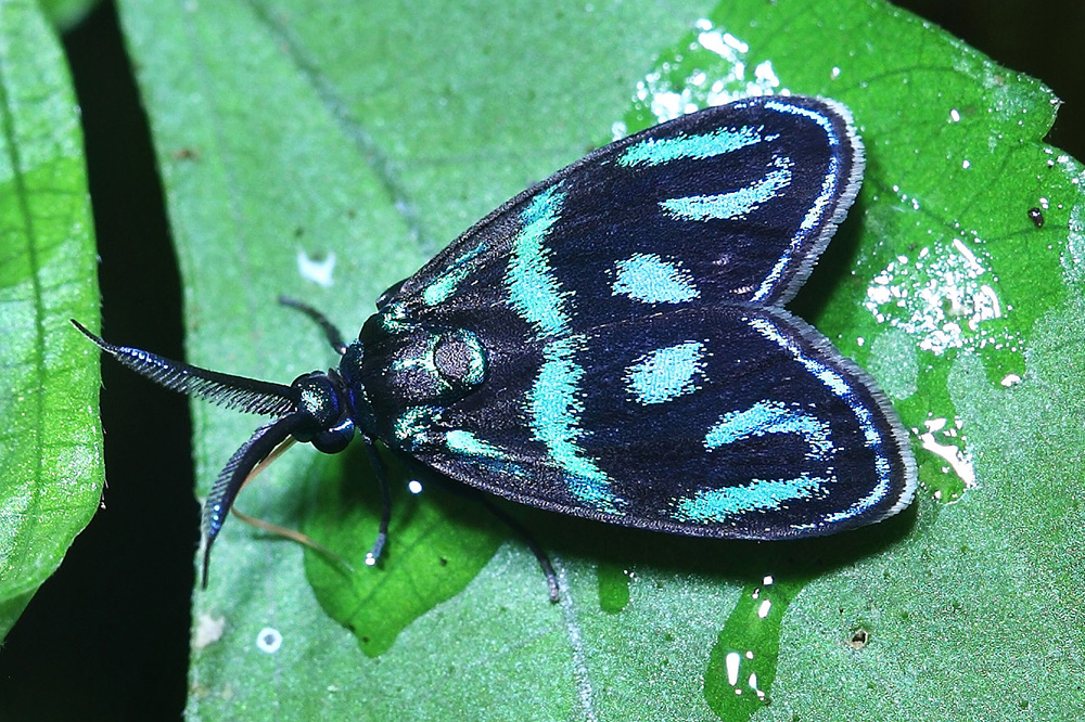 斑蛾科的蛾子多以色彩斑斓、配色清丽而著称,但用色直接对标蓝宝石的蛾子,委实不常见,它就是蓝宝烂斑蛾。蓝宝烂斑蛾体型不大,体长只有8-10毫米,身体只有两种颜色,黑色和蓝色。但那蓝色的斑纹蓝得有些诡异,在阴暗处观察,那就是普通的蓝道道,可能形成蓝色部分的鳞片有某种特殊的反光结构吧,一旦有阳光照到身上,这些蓝色的斑纹立刻闪现出蓝宝石般的反光,非常漂亮。当一群蓝宝烂斑蛾在阳光下飞舞时,就像草丛里撒下了一把蓝宝石般,闪烁耀眼,恍若仙境。