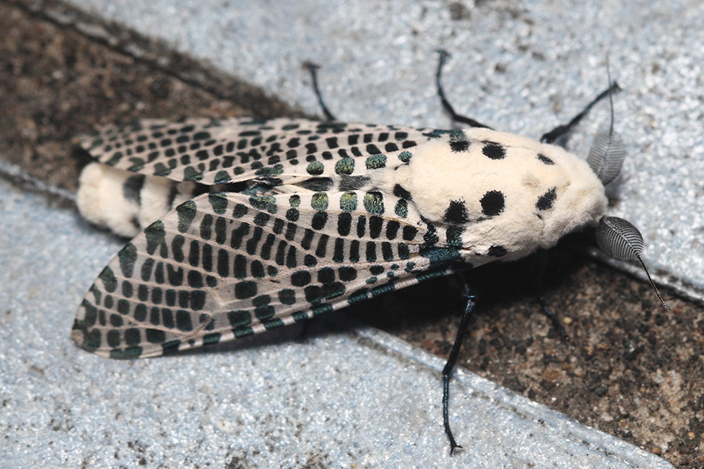 蠹蛾科在昆虫纲是个小单位,周边能看到的蠹蛾科的蛾子实在不多,大斑豹蠹蛾却是蠹蛾科中个大又好看的蛾子。它体长超过25mm,展翅60-84mm,白色为底色,全身布满大小不同的黑斑,尤其前翅上的斑点有大有小,排列有序,大的块状宛如豹斑,这些大块的豹斑还具有蓝色的金属光泽,因此而得名。大斑豹蠹蛾普遍分布于低中海拔山区,成虫很漂亮,但它的娃却是果园的害虫,它的幼虫主要寄生于梨、杏、栎、白杨等多种植物上,所以该种蛾子又叫做梨豹蠹蛾。