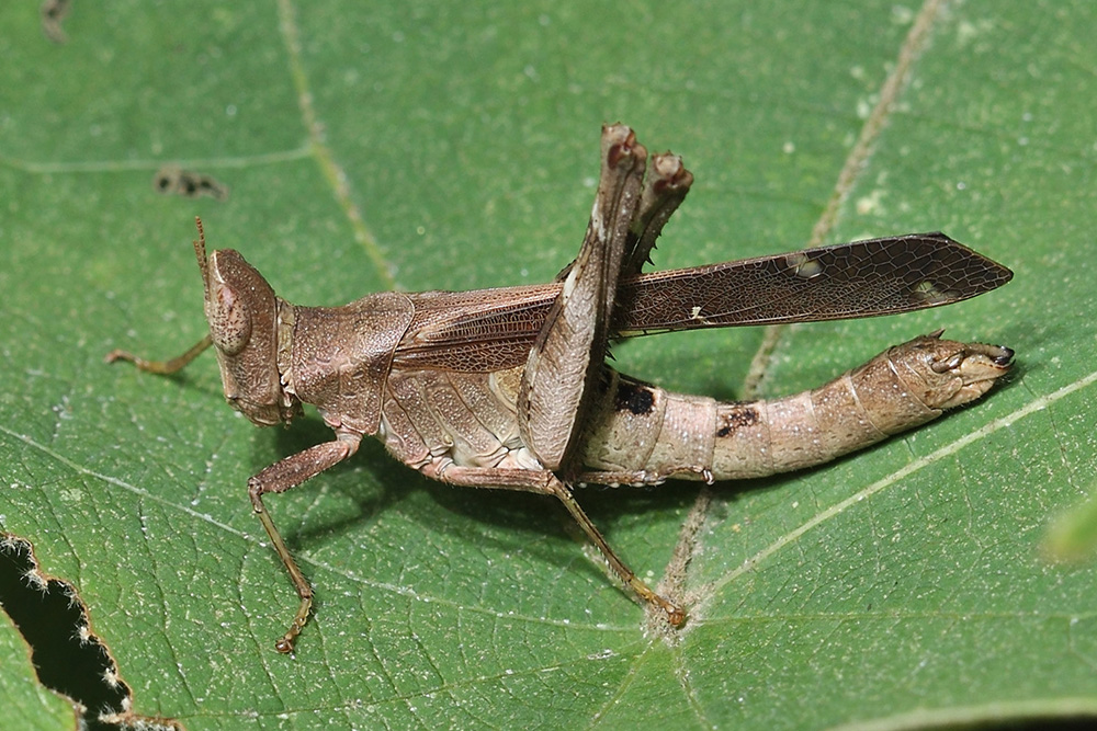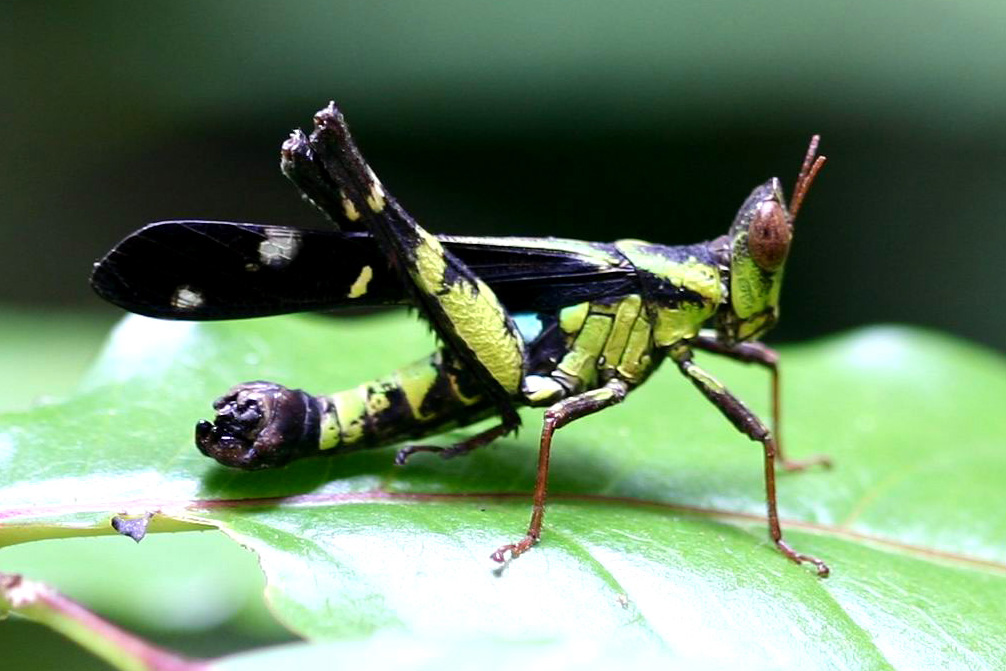 多恩乌蜢属中小型蝗虫,雌雄形态和色彩各不同。雄虫着装艳丽,身体的底色为翠绿色,上面带有黑色和蓝色的斑纹,翅膀为深褐色且具有透明区域,算得上是蜢中的帅哥。怪异的是它的头如马头状,且腹部末端膨大呈球状,不知道有什么功能,推测与雄虫散发性外激素有关。雌虫的打扮就像个仆人,体色暗淡,呈土色,无色斑,腹部末端没有膨大的结构。雄性多恩乌蜢有个奇怪的习性,常到潮湿沙地上活动,吸取沙地中的盐分,或许这些盐分是它们维持体色用于求偶的重要“材料”,相应的,颜色暗淡的雌性就没有被观察到有这样的行为。多恩乌蜢分布在亚热带地区,是我们周边较常见的蚱蜢。