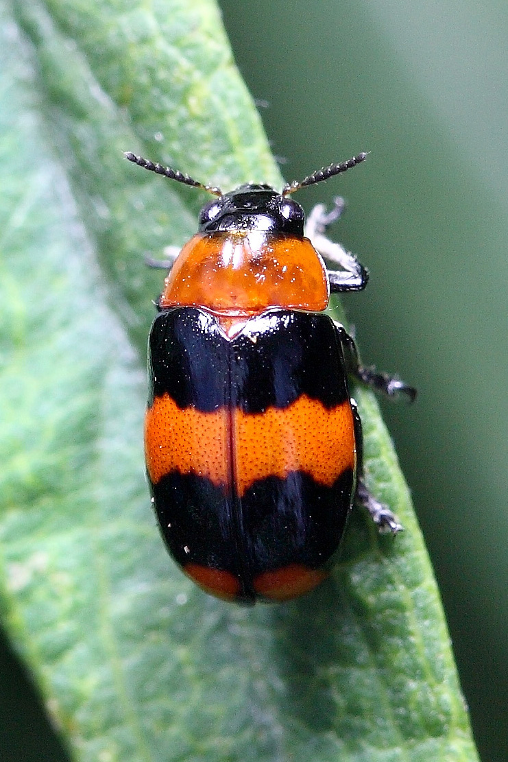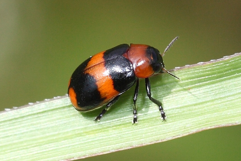 黑额光叶甲(黑星筒金花虫)属鞘翅目叶甲科,其主要特点就是“黑头”,而且是漆黑的那种。身体为红褐色,长约6-7毫米,鞘翅表面有两道黑色的横斑。黑额光叶甲是农业上的常见害虫,成虫主要危害玉米、粟、白茅等植物,在同一叶片上,同一虫的取食位置常常频繁更换,导致受害叶片出现多个或深或浅、形状不一的缺刻。黑额光叶甲成虫具有假死性,在受到突然惊吓时,会立即飞离或作强直性麻痹状昏迷假死,但能较快地恢复知觉,迅速逃逸。