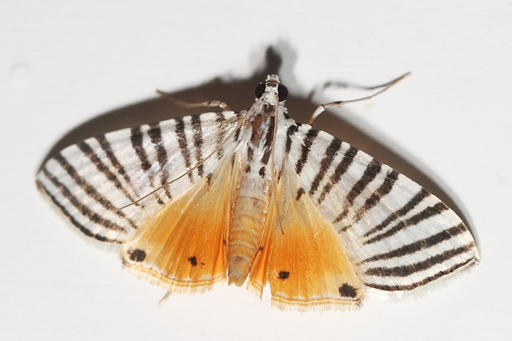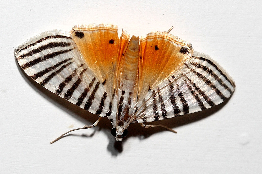 双带蛀野螟算是颜值很高的蛾子,它体形很小,体长只有约7-8毫米,不易被人们注意。一旦它出现在微距镜头下,它的美艳被立即放大。双带蛀野螟展翅呈三角形,底色为白色,腹部和后翅为橙红色,前翅从从内向外放射状的伸出黑色的带状条纹,呈太阳光芒状,美不胜收。 分类:昆虫纲 鳞翅目 草螟科 图像采集地:广西金秀县大凳屯 |