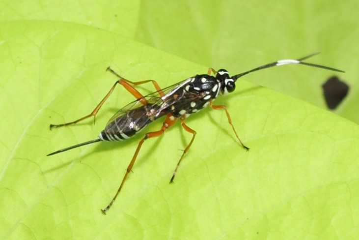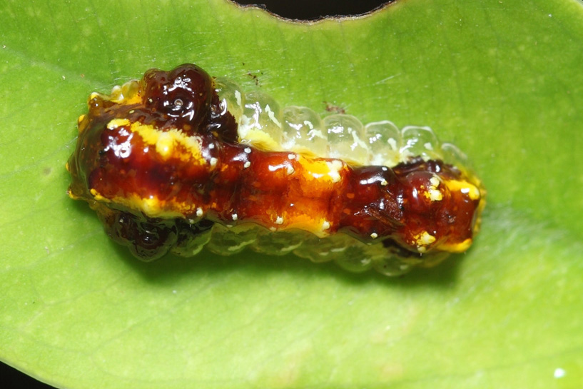 花胸姬蜂身穿黑底白斑衣裳,身材苗条,行动敏捷,喜欢独自在花叶间快速穿行,但对一闪而过的花朵却不屑一顾。问题来了,它不采蜜在干啥呢?花胸姬蜂是一种独居性昆虫,成虫多数时间单独活动,它们喜欢在植物上搜索目标,这些目标就是各种昆虫的幼虫(如朱红毛斑蛾)。一旦发现合适的猎物会用其强壮的口器一针制服并带回巢穴,雌蜂(图二)将卵产入朱红毛斑蛾的幼虫(图三)体内,孵化的幼虫以朱红毛斑蛾幼虫为食并而生长发育。令人称奇的是,花胸姬蜂却是红毛斑蛾自己招引来的。原来,朱红毛斑蛾幼虫主要取食的是椿树的叶片,椿树受伤后会释放一种叫做β-罗勒烯的气味物质,对雌性花胸姬蜂有强烈的吸引力,使朱红毛斑蛾幼虫招来杀身之祸。这也是生物间相生相克,共建生态平衡的一个典型例子。