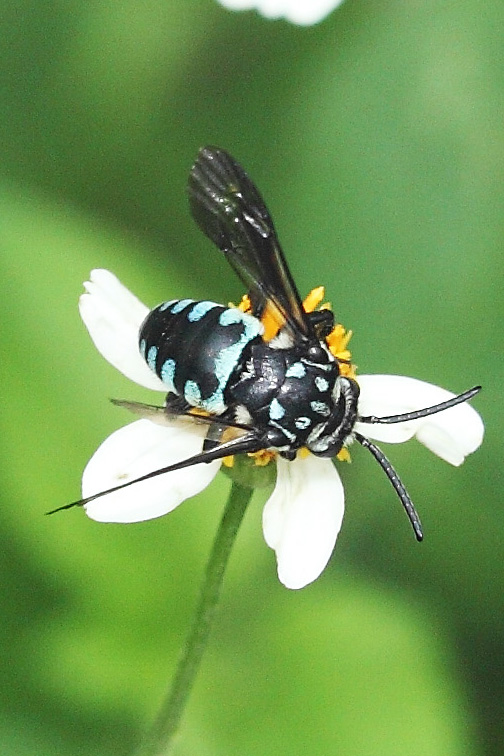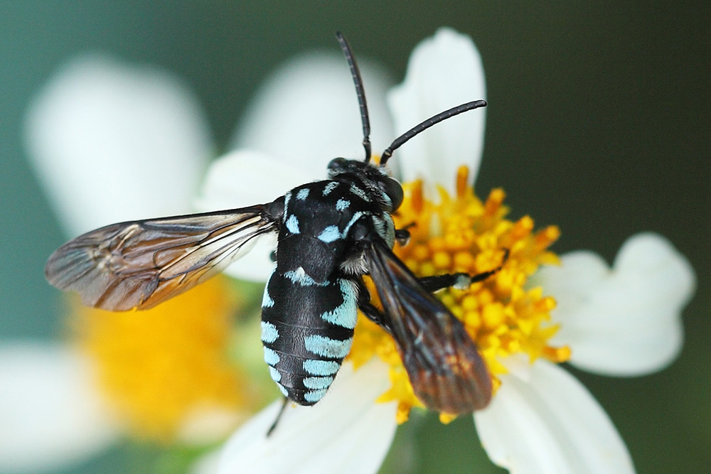 在蜂类群体中,大多数的种类喜欢以黑、黄、白、橙色等颜色来装扮自己,且斑纹大多以条纹为主,但下面出场的这位就比较清新了,这就是喜马拉雅琉璃纹花蜂。喜马拉雅琉璃纹花蜂又叫喜马盾花蜂,身体黑色,胸部和腹部背面分布着两排湖蓝色板块,非常醒目,就像瓷器厂刚出产的琉璃色物件,这也许是这种蜂名字上有“琉璃”二字的原因吧。