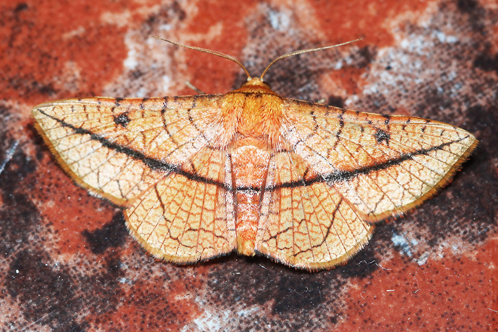 网蛾不常见,但见到却很好辨认,它们大多在翅膀上有网纹,就如一点斜线网蛾。一点斜线网蛾长约12毫米,翅展约为20毫米,翅膀橙色,上有致密的褐色网纹。这种网蛾雌雄个体相互有一定的差异,雄性个体(图一)网纹颜色鲜艳,翅的背面有黑色的“两点一线”,但不知它名字中的“一点”指的是什么。雌性(图二)体型稍小,网纹颜色较淡,翅膀背面没有雄性的那两个黑点。一点斜线网蛾的幼虫主要危害杨梅、余甘等植物,在国内主要分布在黑龙江、四川、广西、海南和台湾等省。