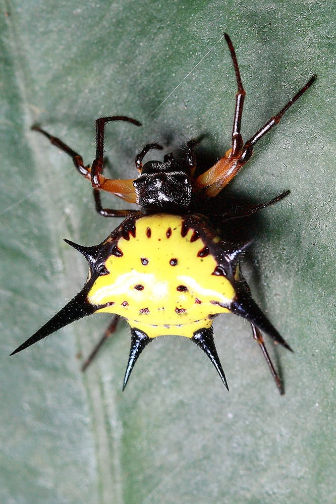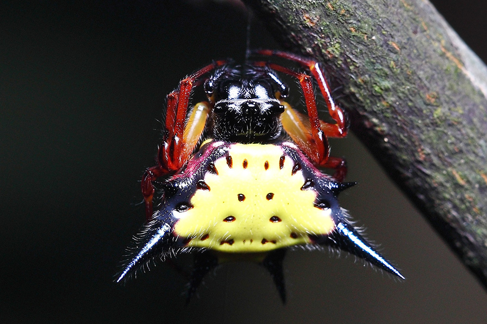 哈氏棘腹蛛的身体底色为黑色,足为红褐色,腹部背面鲜黄色,非常醒目。它色彩艳丽,动作较为缓慢,是一种容易观察和拍摄的蜘蛛。最奇特的是,哈氏棘腹蛛的腹部上长着六条黑色的棘刺,这些棘刺尖锐,不仅扩大了身形,还形成了一种独特的威慑力。哈氏棘腹蛛常见于我国广东、广西、海南和台湾岛,栖息于树林之中,它夜间在树枝间结出垂直精致的圆网,然后就稳坐网中央,静待猎物上网了。