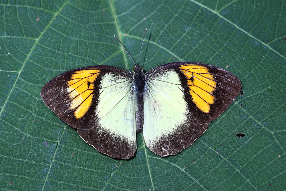 橙粉蝶是粉蝶中比较漂亮的一员,身体上的每一块色斑都展现着粉蝶科的独特魅力。它的翅膀以橙色为基调,点缀着黑、红、黄等斑纹,色彩鲜艳夺目。在飞行时,橙粉蝶轻盈而优雅,身体和翅面上的那层粉末状物质(鳞片)使得它的色彩有一种柔光效果,为它增添了一份神秘感。橙粉蝶有雌雄异型现象,也存在高温期与低温期季节形态差异,下图看到的就是高温期成虫的常态。在繁殖季节橙粉蝶会集中羽化成蝶,常呈爆发状,漫天飞舞的飞碟景象既美丽又壮观。