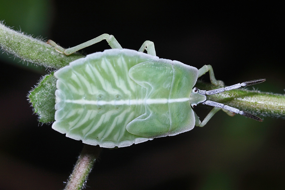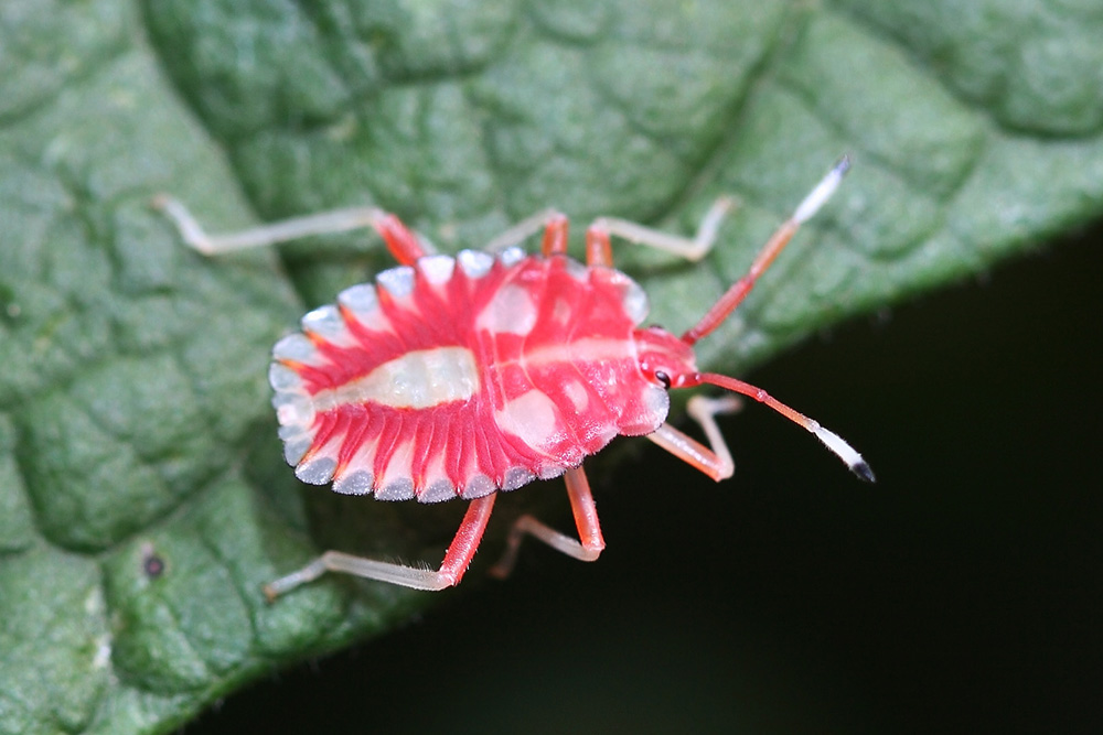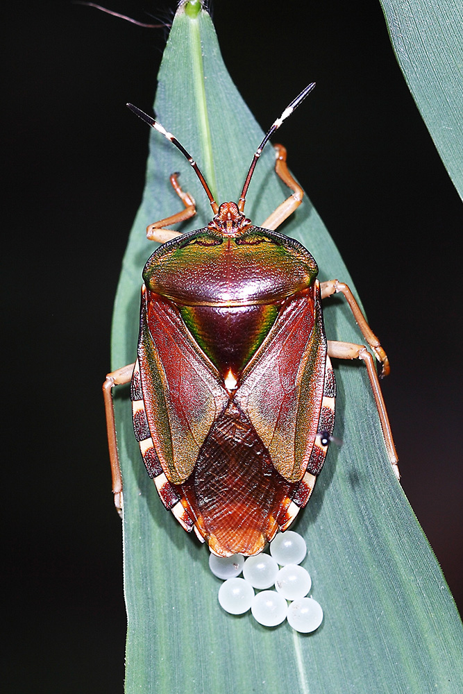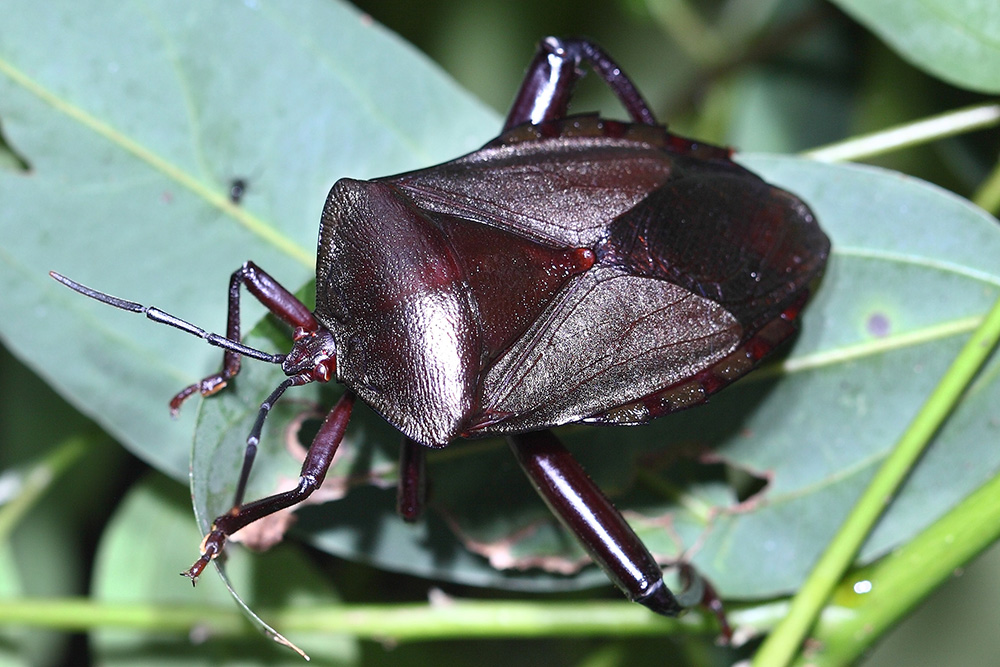 在蝽界,硕蝽是个巨人,它体型庞大,色彩华丽,成虫体长大约在23到33毫米之间,体表呈现的铜质质感令人过目难忘。它的头部小巧而呈三角形,全身布满了细小的刻点,构建了一种古朴的气场。它的身体、翅和足大多呈棕红色,腹部背面则是紫红色,侧缘有两道亮绿色,算是个色彩斑斓的大家伙(图1),在蝽界的确不常见。在硕蝽群体中,体色的深浅有明显的差异,有的个体全身呈黑褐色(图2),疑似雄性个体。硕蝽的初龄幼虫呈现鲜艳的红色(图3),像是有毒的样子,很是可爱。随着幼虫的成长,身体逐渐变为淡绿色(图4),最后一次蜕皮后才变成成虫的颜色。硕蝽在广西南部较为常见,它会散发独特的气味以防御敌害,其口器粗壮而锐利,有可能扎伤人。硕蝽分布在中国南部大部分省区及越南、缅甸等地,它是一种重要的果树害虫,寄主为板栗、梨树、油桐、乌桕等等植物。硕蝽的若虫和成虫都喜欢在新萌发的嫩芽刺吸汁液,造成顶梢枯死,严重影响果树的开花结果。