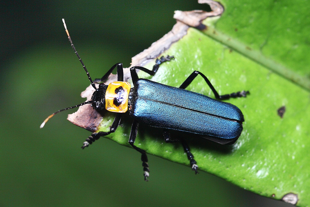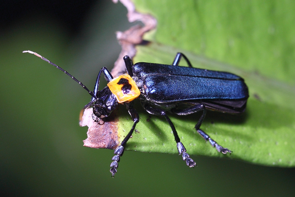 黑斑丽花萤是一种不常见的丽花萤,也是一种漂亮的甲虫,很可能是周围能看到的最大的花萤。它体长11-17毫米,身体黑绿色,头部和鞘翅具蓝绿色金属光泽,前胸背板呈橙黄色,具有一对黑斑,名称中的“黑斑”由此得来。这对黑斑就像两只黑眼睛,专门盯着背后的偷袭者,让它不敢下手。黑斑丽花萤每年5-7月出现在林下灌草丛中,常见于悬钩子、蝙蝠葛等植物上,主要采食花蜜,算是一种典型的传粉昆虫。黑斑丽花萤外表和萤火虫很像(也很像天牛),但并不会发光。