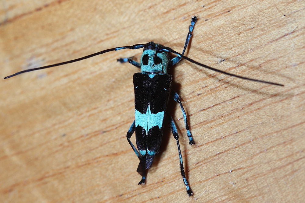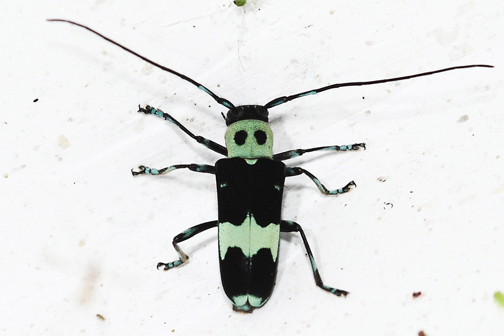 苎麻双脊天牛属小型天牛,体长只有11-15毫米,只有淡蓝色和黑色两种颜色。淡蓝色部分覆盖着一层绒毛,显出粉绿或淡蓝色。苎麻双脊天牛的前胸背板左右分列两个黑色斑点,乍看似两只睁得圆溜溜的大眼,让“偷窥者”觉得总被它盯着看,不敢轻易下手。它的鞘翅斑纹变化较大,形成不同的花色斑,整体看上去活像一个俏皮的小鬼娃,有一点点恐怖,更多的是可爱。说实话,苎麻天牛身体配色虽然简单,但配色协调,也算是天牛家族的颜值担当了。和常见的其他天牛种类相比,它更好动善飞。从名称上也可看出,它的寄主主要苎麻,这种植物是中国古代至今为重要的纤维作物之一,说明这货应该列入农业=害虫的黑名单。