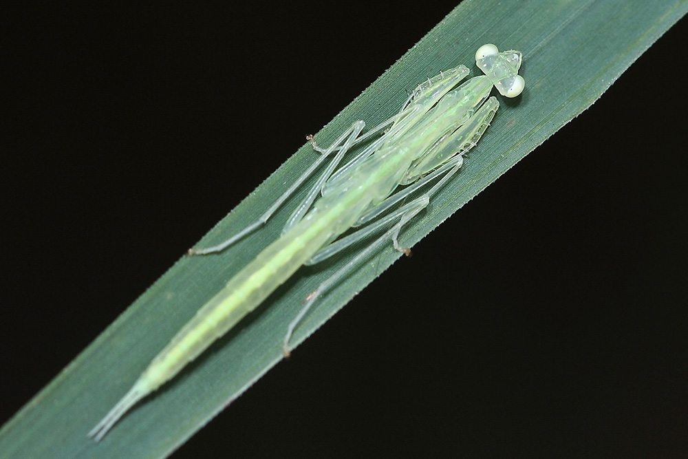 齿华螳是一种极为优雅美妙的螳螂,它的若虫身体是半透明的,因而俗称玻璃螳螂。若虫期的齿华螳(下图)体型小巧玲珑,身体极度扁平,青绿色玻璃状,趴在叶片上就像叶片固有的斑纹,非常漂亮。齿华螳的成虫体长约30毫米,身体和翅常呈淡黄绿色或淡黄褐色。头部扁平,后头在复眼内侧向后凸成瘤凸,触角细长成线形。齿华螳白天紧贴叶背躲藏,只有夜晚才出来觅食。齿华螳螂是中国特有的物种,主要栖息于福建、广东、海南、香港、澳门以及云南等地的草丛和灌木丛中。