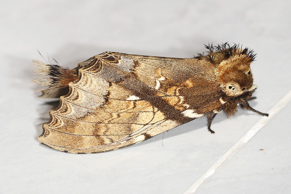 著蕊尾舟蛾是个舟蛾中的大家伙,雌性成虫(图1、2)体长可达到45毫米,翅展达到100毫米。它全身的斑纹完全是照着树皮的斑纹来复刻的,保护色效果非常了得。雄虫体型不仅比雌虫小一圈,且寿命很短,因而不太常见。著蕊尾舟蛾是个戏精,安静时是个乖蛾子的摸样,一旦受惊就立刻变成个大号的幺蛾子。著蕊尾舟蛾成虫腹部末端生有很长很密集的鳞片束,在受到惊吓的时候它第一时间不是想着逃跑,而是会迅速把屁屁翘起来,展开它的鳞片束,像个毛球并在不断地晃动,有人说它更像放烟花一样(图3),还同时发出“吱吱”的声音,可以把你吓得倒退三米。当然,雌性在蛾寂寞的时候也会把菊花举起来,释放出爱的味道,勾引雄性前来,那会就不像在示威了,它那欢快的动作看起来就像是在跳啦啦操。著蕊尾舟蛾这种奇怪的行为,既是为了驱敌也是为了求爱,皆为生存。了解了著蕊尾舟蛾的习性后感觉这家伙还是蛮可爱的,可它的娃就不是这样了,其末齢幼虫身强体壮,体长超过100毫米,褐色的身体配上黄色的长毛,可以把女生们吓得高声惊叫或干脆叫不出声。蕊尾舟蛾主要危害龙眼和漆树等植物,是林业害虫。