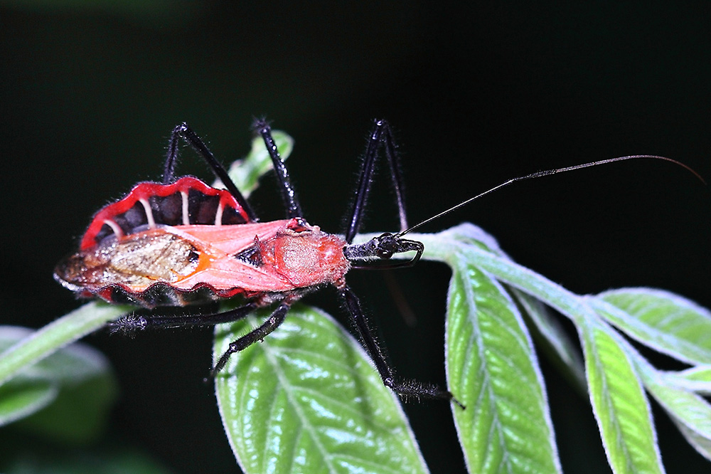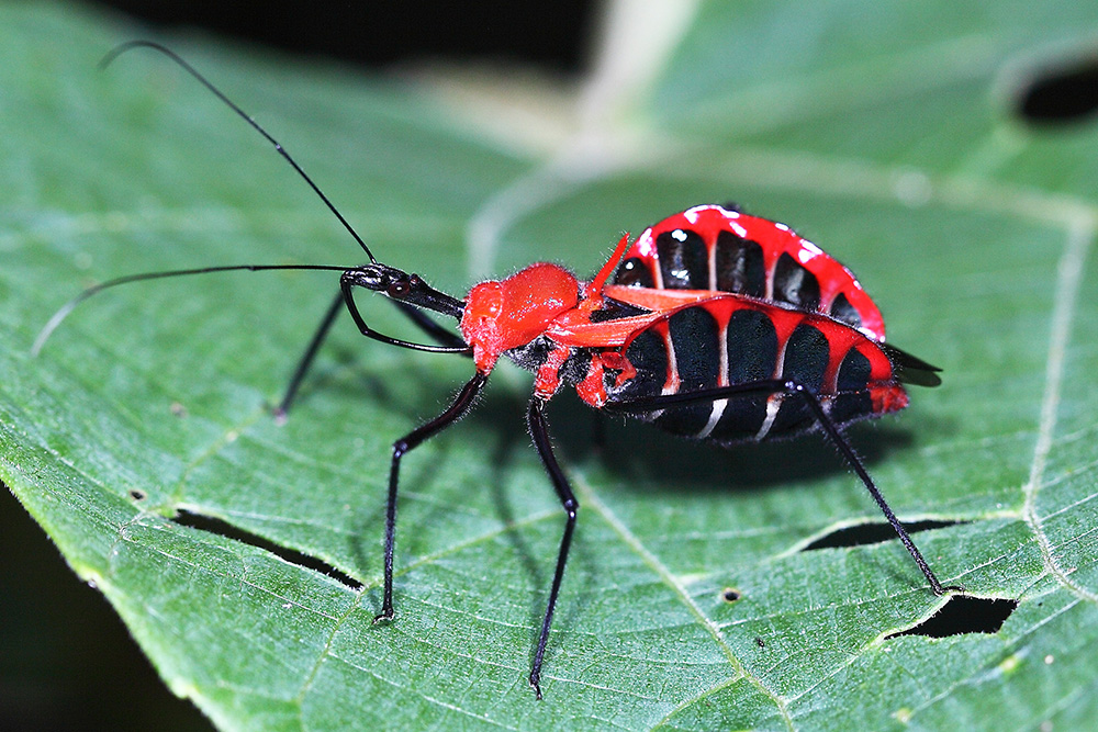 大红犀猎蝽家族中的成员大都是漂亮的家伙,大红犀猎蝽尤其突出。大红犀猎蝽在同类中算是个大个头,体长超过25毫米,它的头和足是黑色的,胸部是大红色的,腹部就不好说了,不知是黑色中夹着大红道道还是大红色中有黑道,反正红黑搭配就是非常的漂亮。与其他猎蝽不同的是,大红犀猎蝽的腹部极其宽大,两侧夸张的向上卷起,似乎在极力显示它的红黑斑,使得它整个身体非常显眼。在野外看到时,喜欢它的感觉美不胜收,不了解它的会感受到一股威慑。其实不用太担心,它无毒无臭味,更不叮咬人,就是单纯的漂亮而已。