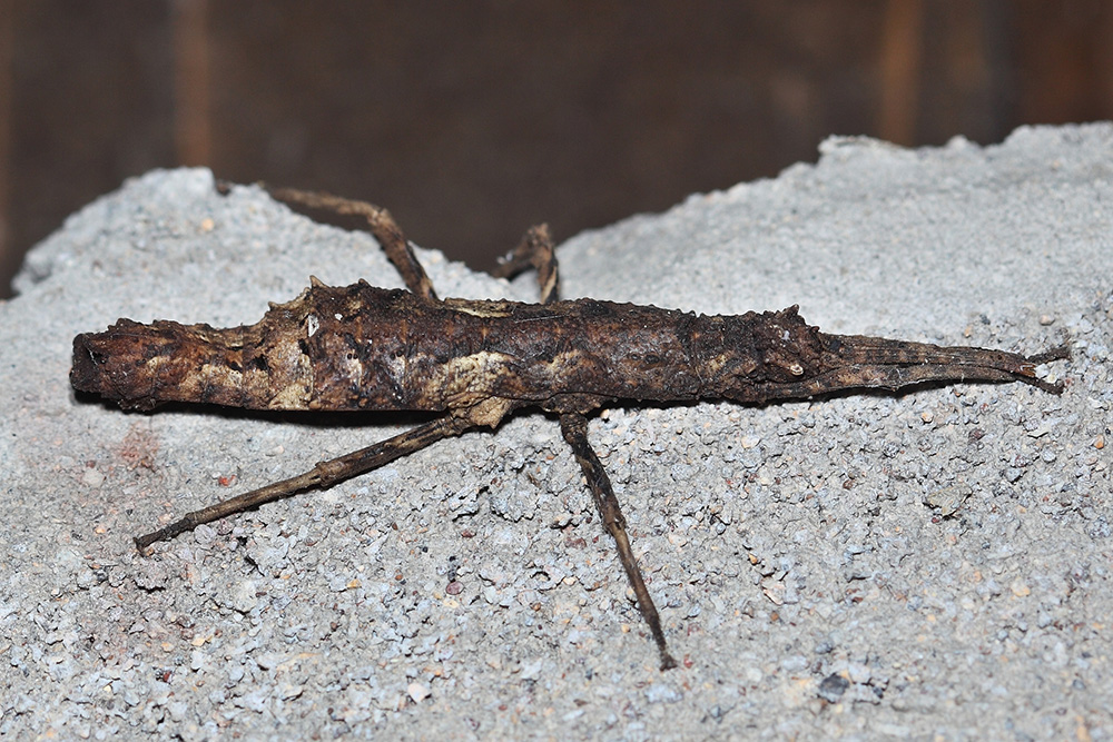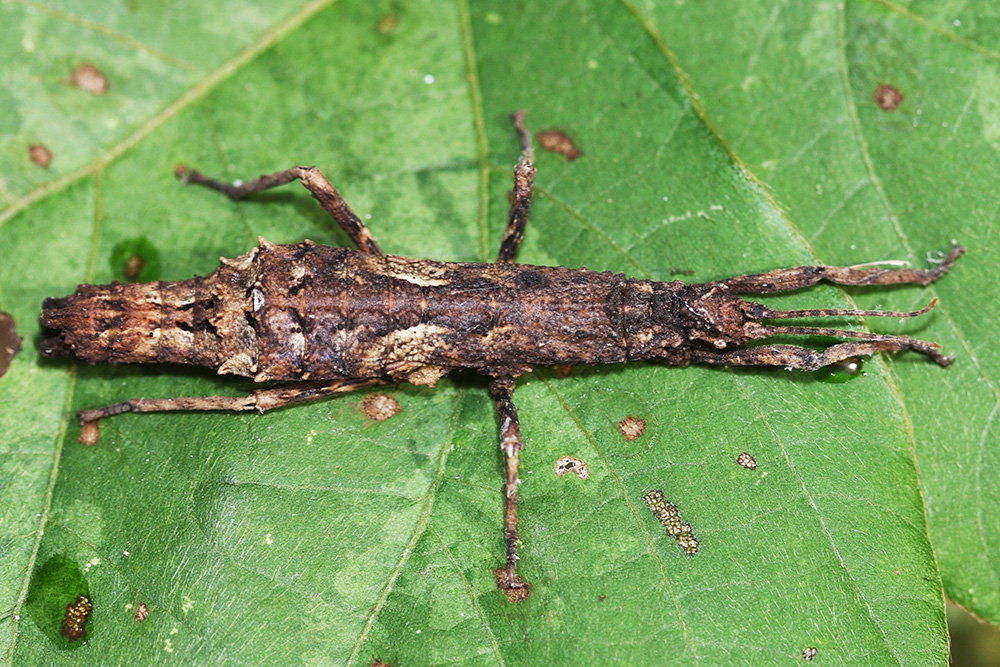 广西瘤竹节虫体长约46毫米,体型短粗,腹部中部较宽,全身布满瘤状颗粒但无刺,体色呈灰白色至黑褐色等多种色型。广西瘤竹节虫也是一位拟态高手,在树干上停留时,六足并拢,整个身体极像一节干枯的树枝,体型、体色、质感与树皮几乎别无二致,轻轻触碰它也不作反应,“潜伏”的决心和效果着实令人惊叹!但广西瘤竹节虫还是脆弱的,它断一两根足尚可存活,断三根以上就会危及生命了。广西瘤竹节虫主要分布于广西、香港、广东、海南、福建等地,其最早发现于广西,因地理特征而命名。广西瘤竹节虫还有一个它的同类没有的高招,就是繁殖方式。由于雄性个体数量远少于雌性(原因不明),多数雌性个体可通过孤雌繁殖方式进行繁殖,即雌虫不经过与雄虫交配受精而直接产卵产生后代的繁殖方式,非常罕见。