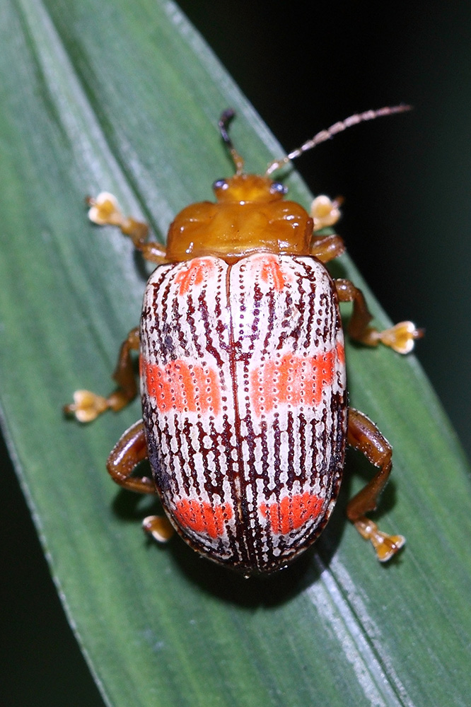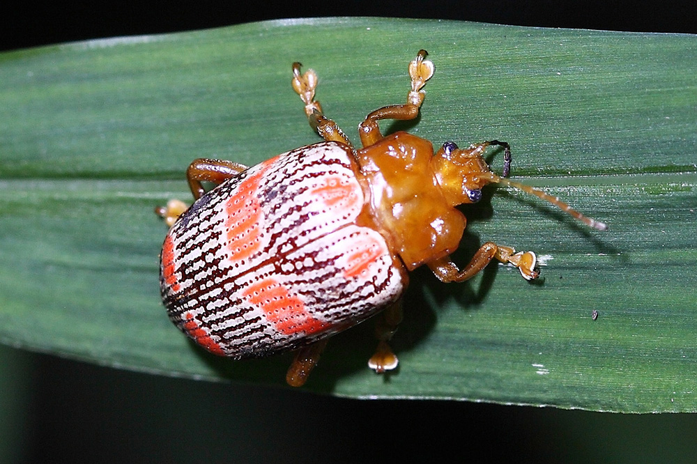 褐带凹缘跳甲是一个身宽体壮的家伙,足特别粗壮,足端都有一个宽大的吸盘,攀附能力很强,不会轻易从植物上掉下来。褐带凹缘跳甲的鞘翅有明显的方形色块,就像背上背了个调色板,由于不同的个体间色块颜色深浅略有区别,当一群个体聚集时,色彩纷呈犹如一个调色板。褐带凹缘跳甲分布于广西、云南和贵州等省,不太清楚这家伙的食性和繁殖方式。