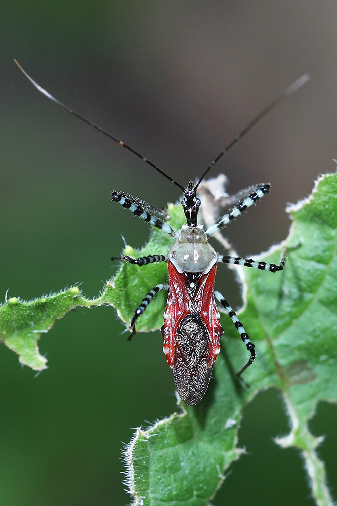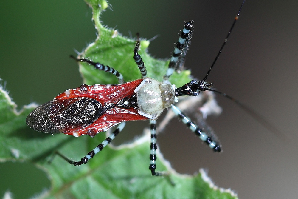 革红脂猎蝽是一种分布很广的中型猎蝽,体长约20毫米,它以其灰身、红翅、斑马腿的打扮被誉为中国猎蝽界的颜值巅峰。革红脂猎蝽一身充满新潮气息,身穿黑白条纹装显得精神帅气,斑马型“袜裤”把细腿紧紧包裹,纹路细密显得气场满满,它的红色披风交错叠搭,就差一阵东风把潇洒激活了。这货还拥有一件灰色的披肩,披在红色披风之上,使得它的打扮艳而不俗,把一身行头整体拉升到轻奢美学新高度。这货一出场就是时尚大片,不打光就能自带炫目光环,直达猎蝽界的“颜值天花板”。这么赞美它虽有点过分,但不得不说,大自然真是最顶级的“美妆师”,这种平日里让人敬而远之的猎蝽描绘出如此惊艳的颜值,不服不行啊!