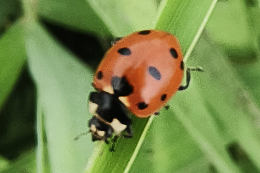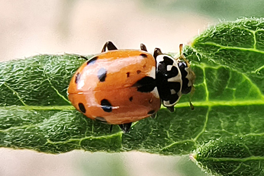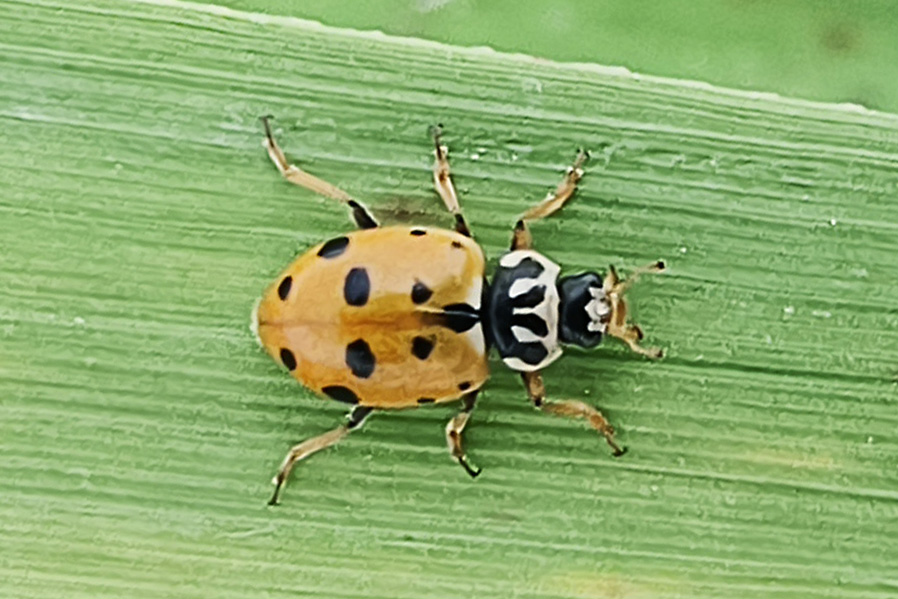 多异瓢虫成虫个头比较小,体长只有4-5毫米,呈长圆形。它头胸部黑色,具黑色横带并带有四指状黑纹,鞘翅黄褐至红褐色,两翅共具13个经常变异的黑斑,其斑点数量、大小、和排列变化多端,组合超100种,很容易被误认为不同种的瓢虫,因而得名“多异”。多异瓢虫主要广泛分布于我国西北部,捕食棉蚜、麦蚜、豆蚜及玉米蚜,是农业上的益虫。