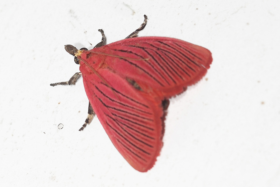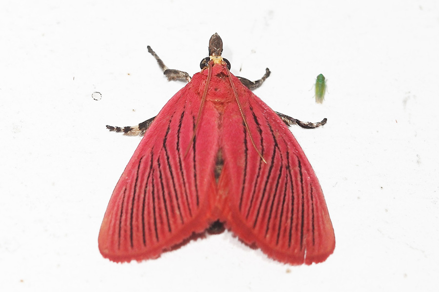 黑脉厚须螟是螟蛾科的一种漂亮的昆虫,其体型属中小型,翅展约28毫米,前翅呈红色并分布细密的黑色纵纹,纵纹未端延伸至翅基与外缘。该物种分布于低中海拔山区,白天常见于叶面活动,局部地区种群数量较为常见。黑脉厚须螟的幼虫主要危害樟树,是森林中的害虫。 分类:昆虫纲 鳞翅目 螟蛾科 图像采集地:广西壮族自治区金秀瑶族自治县大凳屯 |