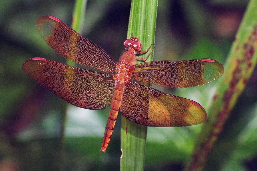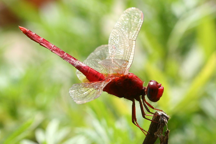在野外的池塘、水田里,经常会看到许多红蜻蜓,它以鲜明的色彩、优美的体态吸引着人们的目光。“红蜻蜓”并非生物学分类上专指的某种蜻蜓,而是一类红色蜻蜓的统称,通常用来描述头部或胸、腹、翅部呈现红色的蜻蜓。观察发现,这些“红蜻蜓”都是雄性的,同种的雌性蜻蜓却大多为黄色、褐色或其他配色。进一步观察还发现,雄性的“红蜻蜓”幼年期也是其他颜色的,随着性成熟才逐渐变成鲜艳的红色,这是一种怎样的生理机制呢?科学家研究发现,这类蜻蜓的体内含有一种红色特征较强的眼黄素,这种色素在氧化还原反应中呈现不同的颜色,还原态呈红色,氧化态呈黄色。成熟的雄性红蜻蜓体内抗氧化物质较多,体内的眼黄素大多为还原态,因而呈现鲜艳的红色。研究人员通过实验室的实验发现,红蜻蜓的体内色素加入氧化剂时会变成黄色,再加入还原剂时则又变回红色。如果向黄色的雌性蜻蜓体内注入还原剂,它们也会变成红色。“红蜻蜓”的红体色有抗紫外线能力,是雄性具备性性成熟的辨识特征,也有一定的警告作用。我们期望对红蜻蜓的研究能开发出抗氧化剂造福人类,当然,更重要的现实价值是为我们持续提供满满的情绪价值。