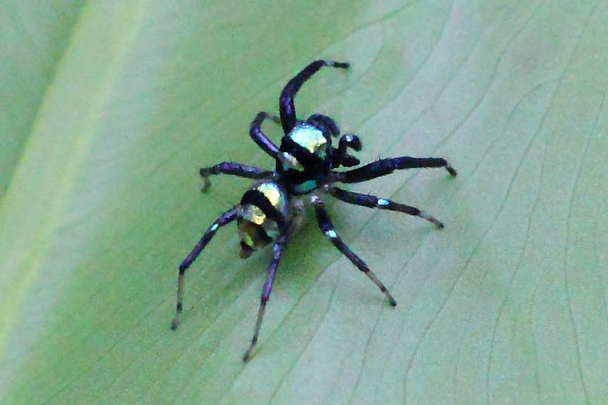 跳蛛科的金蝉蛛属拥有一批小帅哥,悦金蝉蛛就是一位排名靠前的靓仔。悦金蝉蛛体型很小,身体只有一粒米大小,体型虽小却挡不住人家梦想成为艺术家的决心。似乎为了表达对斑马的敬意,它用黑颜色把自己身体画出斑马纹,用祖传颜料在身上涂抹出带有金属反光的彩色横纹,在阳光照耀下十分耀眼,犹如彩虹落在了它的身上,颜值满满。别看外表秀美,它却是草丛中的美艳杀手,是小虫们避之不及的夺命恶魔。