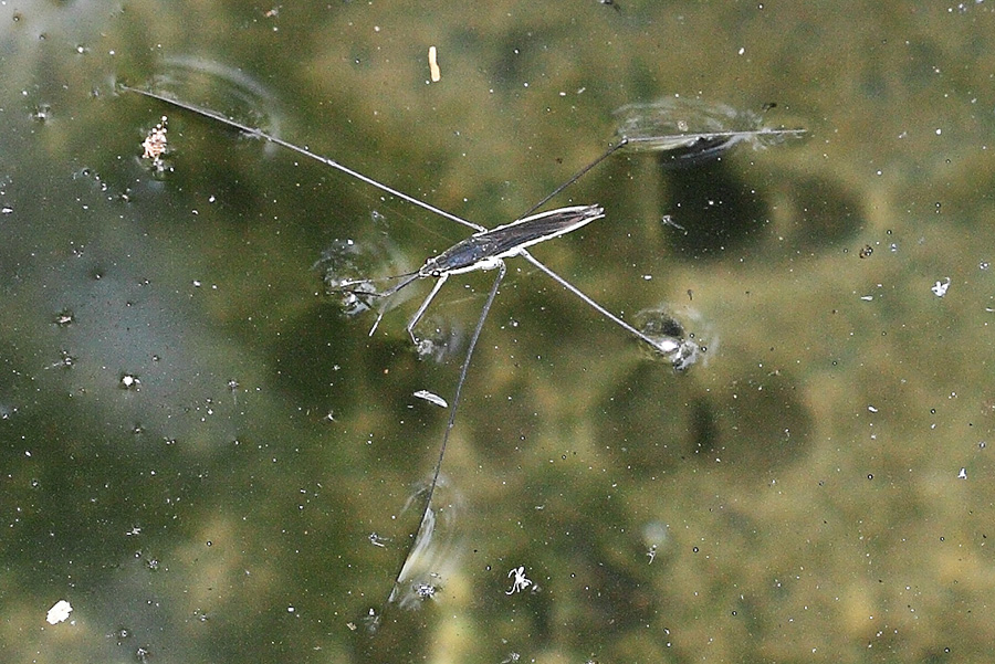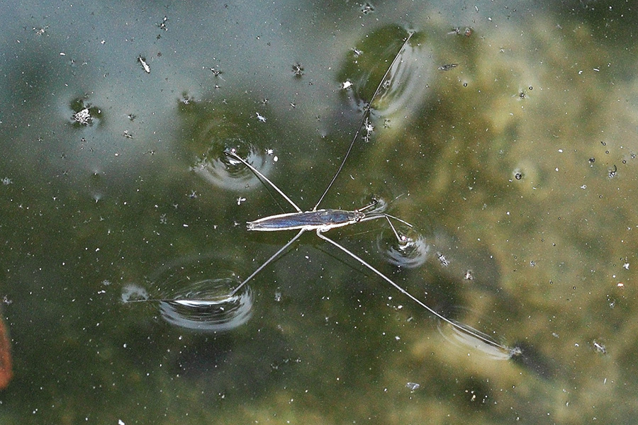 在乡村的池塘上,我们常常能目睹一种形似大号蜘蛛的虫子,尽管它们的腿细长如丝,却能在水面上行走自如,如同在水面上翩翩起舞的舞者,其中就有一位叫做细角黾蝽的主角。细角黾蝽体形狭长,身长约15毫米,长着修长的腿,能跑善飞,是一种独特的半水生昆虫。细角黾蝽的“水上漂”的绝技从何而来呢?这绝技的秘密在于它们腿部的特殊结构,细角黾蝽是如何利用其细长的足在水面完成“水上漂”,却又能保持浮而不沉的呢?科学家们经过深入研究发现,细角黾蝽的足部结构具有与众不同的“黑科技”,它有三对足,第一对为捕食足,后两对为运动足。后两对足细长,足尖上布满了数千根微米尺度的刚毛,这些刚毛比人的头发细得多,直径还不到3微米。而且,刚毛表面有螺旋状的纳米结构沟槽,沟槽里能吸附许多气泡,形成了一层气垫,具有超强的疏水性能,就好像给水黾的脚穿上了一双“气垫鞋”。有了这层气垫,水黾就能在水面上轻松地行走、奔跑、跳跃。细角黾蝽的求偶方式也十分独特,雄虫会通过振动水面来向雌水黾发出求偶信号。雌虫收到信号后,便会一边“复电”,一边向雄虫游去。细角黾蝽足部的超疏水特性为科学家的仿生设计提供了奇妙的思路,在船舰设计中就极具价值,若模仿其结构用于疏水减阻,一定能够提升航行效率。