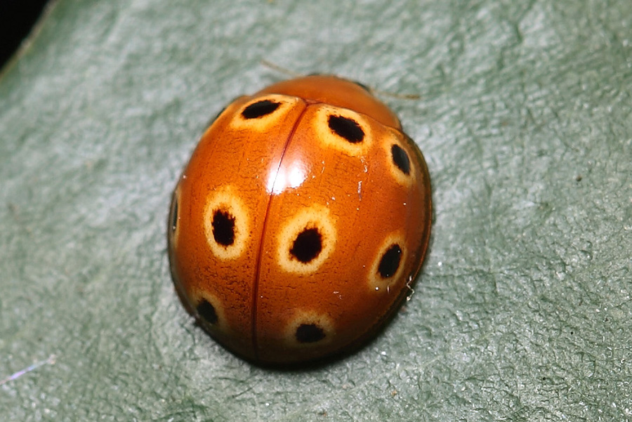 瓢虫都是半球形的,不同瓢虫的鞘翅上有不同的斑点,但十眼裸瓢虫有点特立独行。十眼裸瓢虫的鞘翅为橙黄色,体长约7-8毫米,鞘翅上共有10个斑,每一个斑点是中心是黑褐色的,斑外有黄色的圈,就像某种鸟类的眼睛,这是它名称上“十眼”的来源。想想周围肯定没有人愿意被十只“眼睛”盯着,这“眼睛”就是对天敌的警告。 分类:昆虫纲 鞘翅目 瓢虫科 图像采集地:广西壮族自治区平南县北帝山 |