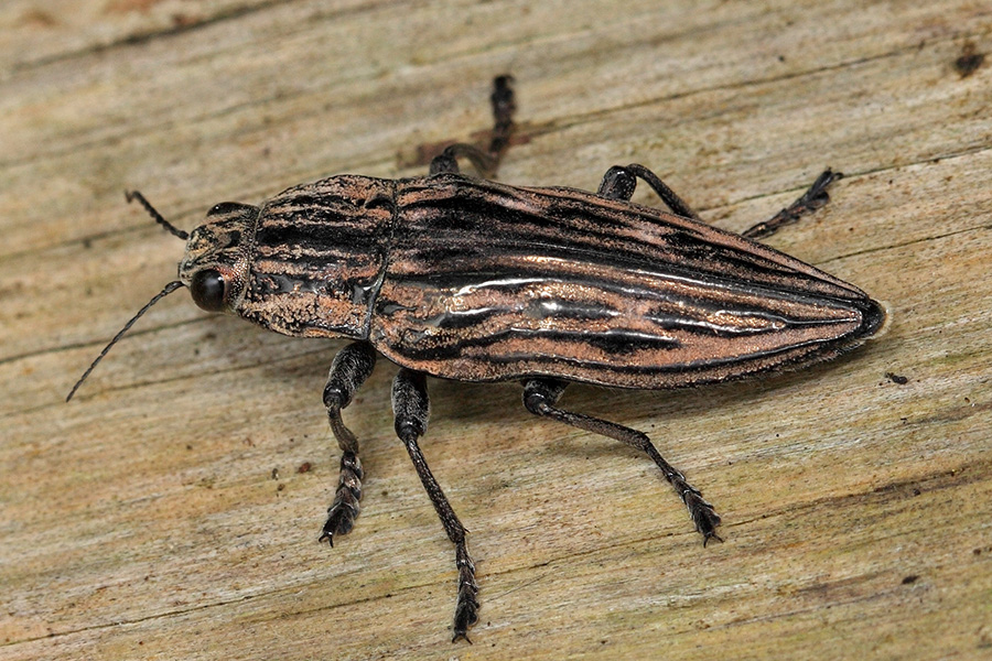 云南脊吉丁是一种体型较大的吉丁虫,成虫体长26—32毫米,宽13—14毫米,它是我国南方松树林中常见而又不易发现的昆虫。云南脊吉丁通体呈黑褐色或铜褐色,前胸背板具5条纵雕脊纹,鞘翅带有8条纵雕脊纹,翅缝隆起发亮,头部有一对半球形向前凸起的复眼。这货生性腼腆,情绪稳定,静静地趴在松树树干上,凭着拟态松树皮的造型,即使离得很近也难以发现,这就是为什么说它常见而又不易发现的原因。云南脊吉丁大多生活在松林中,幼虫阶段会钻蛀松科植物的树干,破坏树木的输导组织,导致树皮爆裂,危害不小。该虫主要分布我国福建、湖北、江西、湖南、广西、四川、云南、贵州等省区。