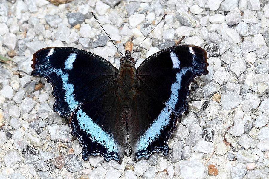 琉璃蛱蝶为中型蝴蝶,翅展超过73毫米,翅的正面以黑色为底,最显眼的是它翅面上有两道蓝色镶边,透出黑底蓝光的细腻光泽,犹如琉璃之上的精巧花纹,低调却不失奢华,显示出温文尔雅的青衣风范,一种古朴的美感扑面而至。琉璃蛱蝶属于典型的两面性生物,虽正面的色彩绚烂,反面却色彩斑驳(图2),宛如古铜色铁板上的锈蚀斑纹,高仿枯槁的树皮,常常被误认为是枯叶蝶。琉璃蛱蝶喜欢双翅平展停留在空旷的石块或路面上,一旦受到惊扰便像一道蓝色闪电般飞走,往往会有九成以上的概率再次返回原先的栖息地点,让你静候观赏。雄蝶有较强领地意识,会强力驱逐进入其领地的蝴蝶。琉璃蛱蝶在自然界的分布广泛且常见,成虫生活在低、中海拔的山区,喜食树液、腐败的水果、动物粪便及花蜜。幼虫以菝葜科、百合科植物叶片为食。