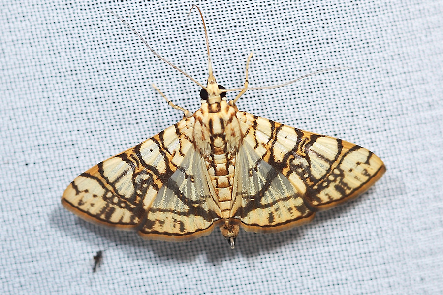 黄翅绢丝野螟是一种小型蛾类,体长只有10毫米,远观毫不起眼,但在微距镜头下观察便倍感惊艳。黄翅绢丝野螟成虫的底色为土黄色,上面布满了褐色网状斑纹,像是用绢丝绣成的锦缎,也像从高空观察地面的道路和河流,后翅的前半部分为透明区,无论色彩和斑纹都与树皮的斑纹相似,有效地隐藏了自己。黄翅绢丝野螟幼虫的寄主是菠萝蜜,主要危害菠萝蜜的果实,特别是幼果,是菠萝蜜果园的害虫。
