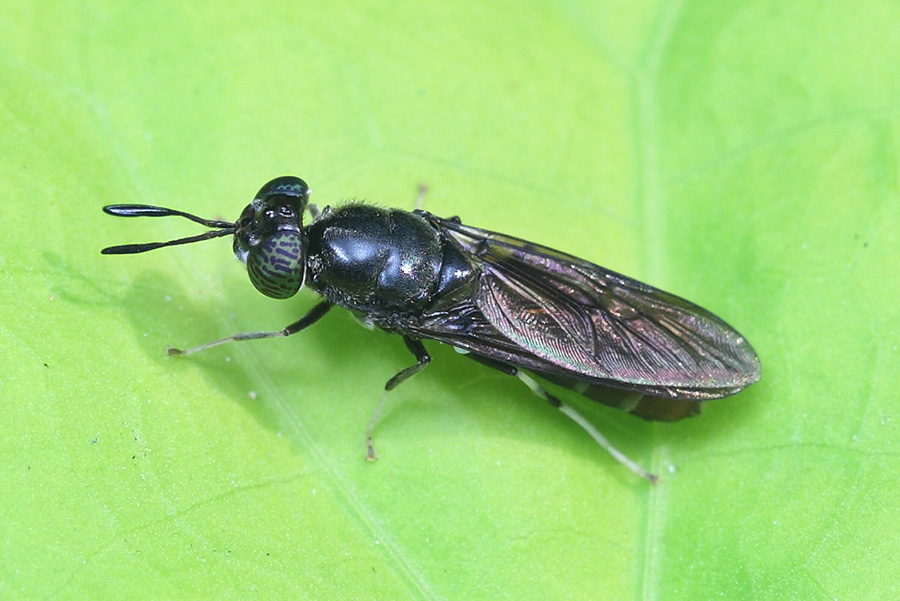 光亮扁角水虻又叫黑水虻,体长15—20毫米,成虫外观很像黄蜂。光亮扁角水虻整体以黑色为主调,翅为灰黑色,口器已退化。亮斑扁角水虻是一种起源于南美洲的昆虫,现在全球各地均有分布。它的娃是一个妥妥的大胃王,这娃食性广泛,食量极其巨大,钟情于菜叶、果肉、肉类以及剩饭等质地较软的厨余垃圾,对禽畜粪便也来者不拒。吃得多拉得快,对有机垃圾、动物粪便的转化率非常高。经过虫吃的垃圾只剩下虫子和虫粪,真正可实现垃圾“零排放”。光亮扁角水虻繁殖速度很快,一对黑水虻成虫能产下多达500至1000粒的水虻卵,而这些卵在适宜的温度和湿度条件下,仅需约三天即可孵化,幼虫7天就能长到两厘米长,进而羽化成成虫。光亮扁角水虻幼虫虫体营养成分高,含有丰富蛋白和多种氨基酸,其虫体烘干后可作为动物饲料的蛋白质来源,因此,光亮扁角水虻在饲料应用和垃圾处理方面显示出很好的开发利用价值。光亮扁角水虻分布于我国贵州、广西、广东、上海、云南、湖南、湖北等地,在全世界分布广泛。光亮扁角水虻的人工饲养技术现在已经相对成熟,可以进行工厂化生产。