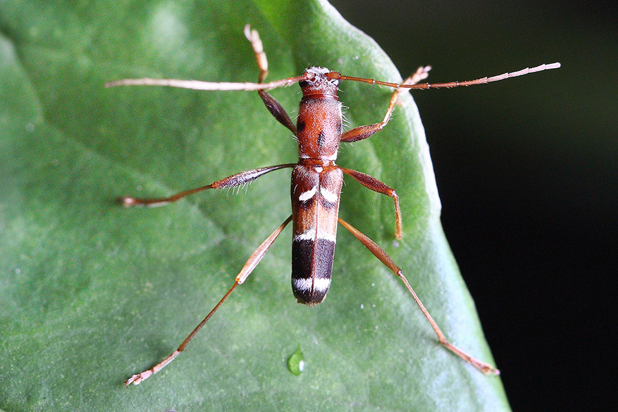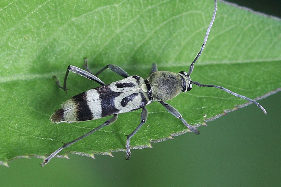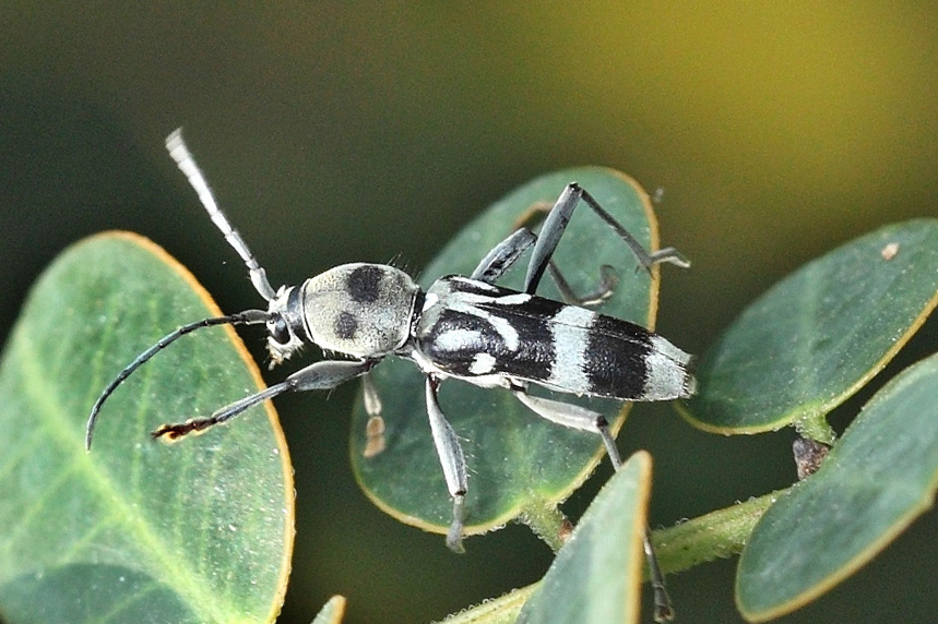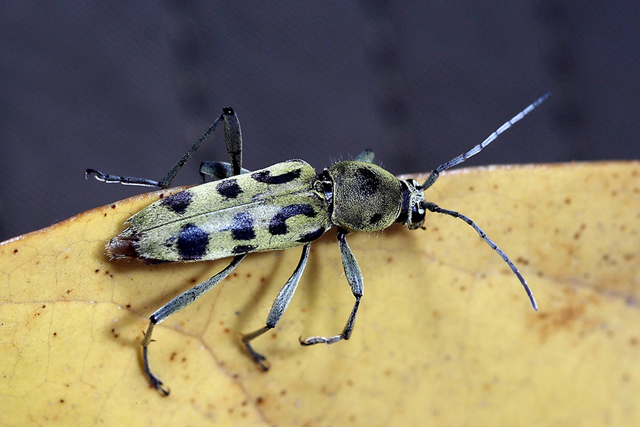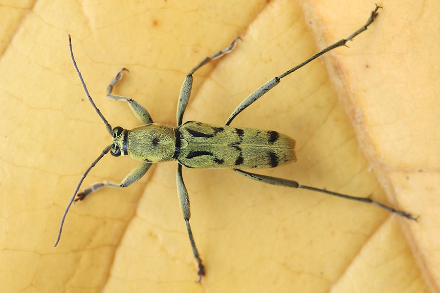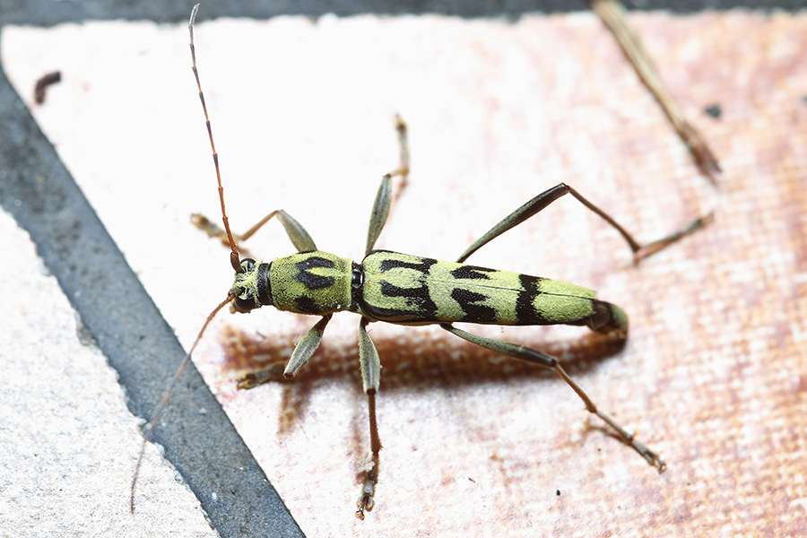 天牛科中有一个虎天牛属,里边的天牛最大的特点就是像虎,准确的说个个都想象自己是只虎。看上去它们的确是有点虎的意思,穿上黄绿色底色的外衣,描上黑色的斑纹,如猫似虎。虽有了形但神还是差了很远,虎天牛属的天牛大多体型较小,体长多在10毫米左右,形体细长,虽虎纹在身,别说虎威,连虫威都谈不上,且衣着雷同,还不太容易辨认。
