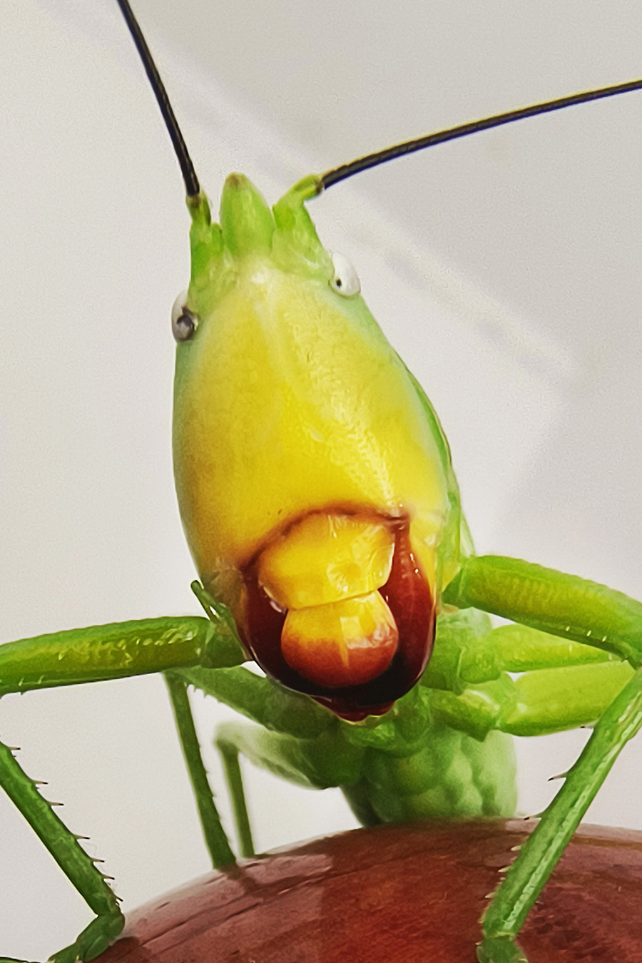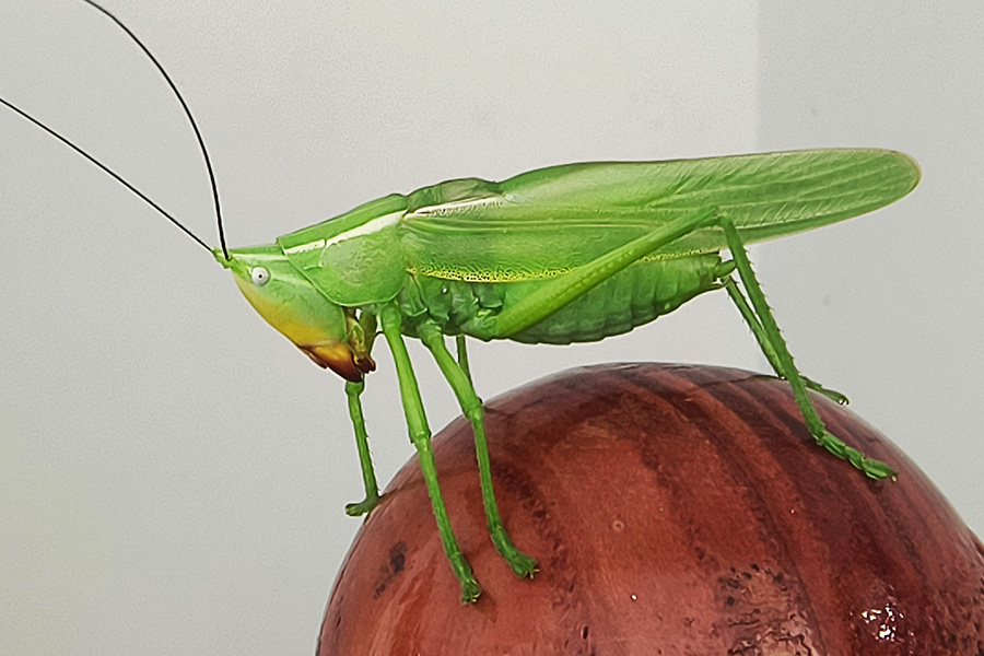 这是一种绿色的螽斯,与其他同类长的大差不差,体长介于42至58毫米之间。优草螽翅膀狭长,各足均为绿色,而跗节则呈黄褐色。它长着一个大脑袋,上颚相当发达,橙红色的大板牙很显眼,咬合力也很出色。它喜欢在夜里抖动翅膀高歌鸣唱,发出的声音类似于电弧的“呲呲”声,用以吸引雌性和占领地。从正面看这家伙的头部呈水滴形,绿色的脸,尖尖的头,红色的大板牙,咧着嘴,一副囧态,千万不要在用餐时正面看这货,笑到你喷饭。它们主要以植物为食,喜欢吃树叶和嫩芽,尤其是竹子、藤蔓、茭白等植物是它们的主要食物来源。在野外,它们在低海拔山区、草地活动,主要分布于我国西南地区。