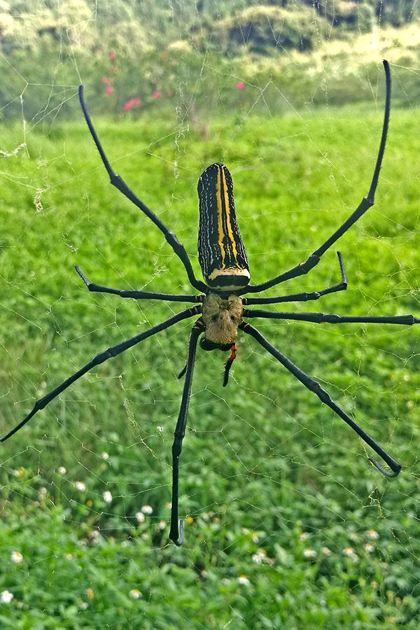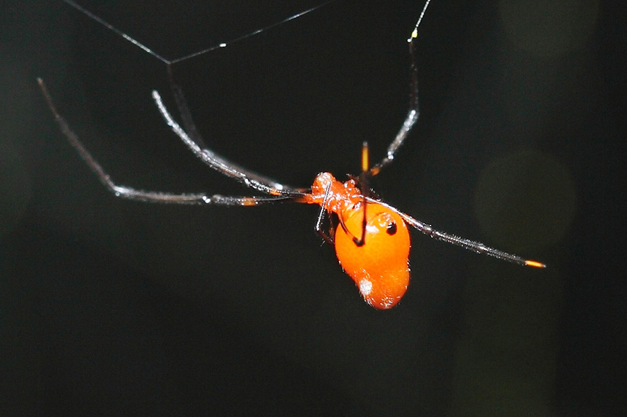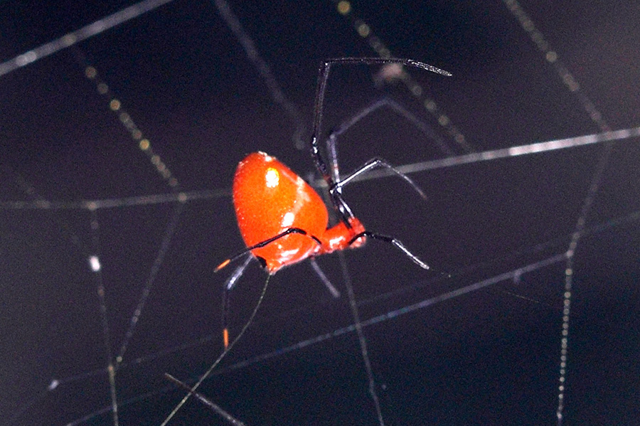 黄银斑蛛是一种很小的蜘蛛,雌蛛(图1)体长约4毫米,身体橙黄色,腹部背面有多枚白班,雄蛛(图2)体型更小,体长只有2毫米,腹部只有一枚白班。黄银斑蛛是个典型的懒汉,不结网不捕食,具有盗寄生习性,常赖在斑络新妇(图3)的蛛网上,靠吃斑络新妇剩下的残羹冷炙生活,一张斑络新妇的蛛网上有时有多达十几只黄银斑蛛在蹭饭。为什么它们不被斑络新妇吃掉呢?原来斑络新妇的蛛网是雌性织的,雄性斑络新妇不织网且体型很小,比黄银斑蛛大些,呈红色,很像黄银斑蛛,也在同一张蛛网上蹭饭。可能雌性斑络新妇误认为黄银斑蛛就是自己的男朋友,她正为自己有那么多的追求者而暗喜呢,自然就没下杀手。但黄银斑蛛的存在占用了斑络新妇的食物,会明显影响雌性斑络新妇的体重、生存率及繁殖率。黄银斑蛛在国内分布于湖南、福建、广西、台湾等地,国外见于新加坡、印度尼西亚、缅甸及斯里兰卡