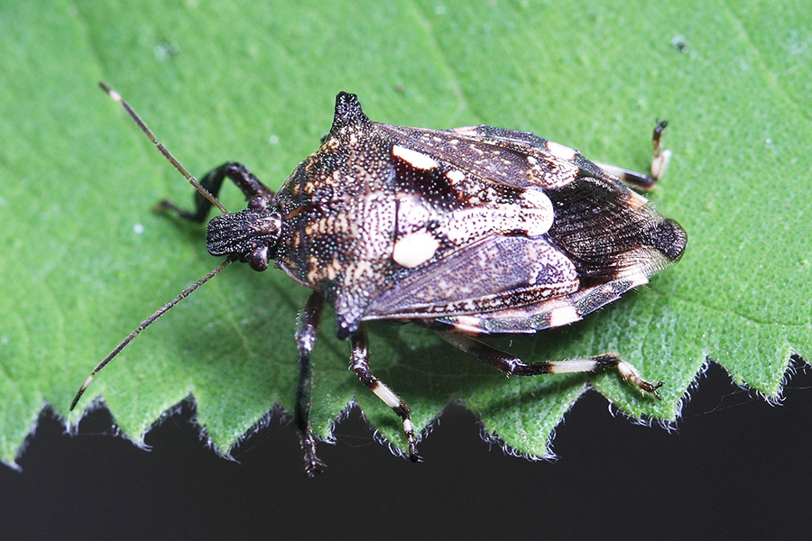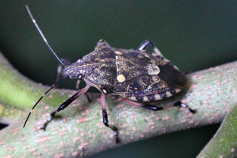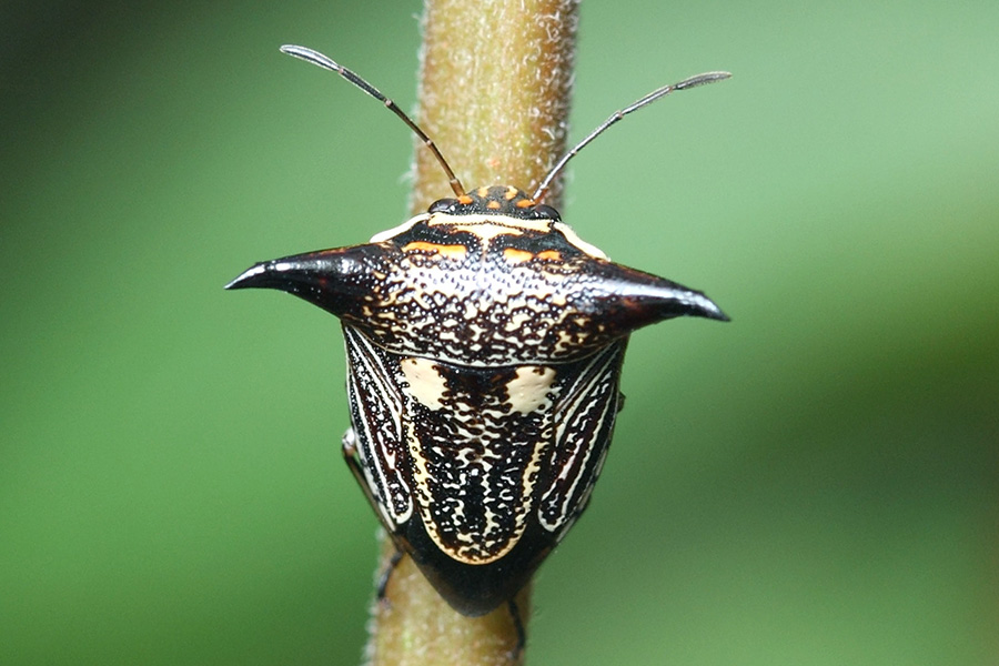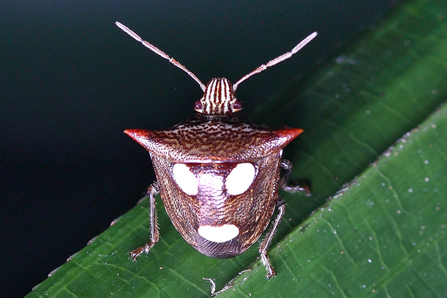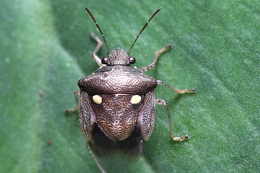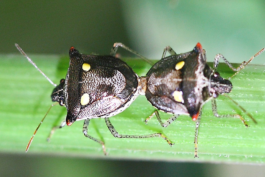 蝽科的昆虫总给人一副“臭屁虫”的印象,受到惊吓便释放出一股臭气,拒人以10米之外,实在不讨人喜欢,但这也是它唯一能拿得出手的武器了。这种“化学武器”大多属于二元化学武器,其原料在虫体内分别储存在不同腺体中,没有毒性和气味。实施化武攻击时,两种(或多种)液体同时喷出,接触反应瞬间合成臭味或腐蚀性产物而达到攻击目的。其实,不是所有的蝽类昆虫都会“放屁”的,它们虽然有着相似的体型、配色、斑纹和生活习性,但因种而有差异,不是专门的研究者或爱好者还不易区分。它们的一些种类很喜欢在自己的身上点上浅色斑点,斑点的大小、颜色、数量各有不同,以彰显个性,同时也成为我们辨认它们的标志。