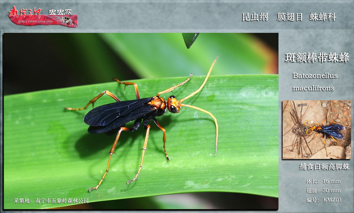 的代表。斑额棒带蛛蜂是蜂类昆虫,经常低飞于森林下层或草丛间,发现蜘蛛后,就会跳上蜘蛛身上,用腹部毒针快速刺入蜘蛛神经节分布之处,使蜘蛛迅速被麻醉