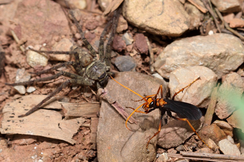 ,成为蛛蜂和孩子们的美餐。蛛蜂能猎杀比自身大N倍的蜘蛛(下图黄头蛛蜂正在猎杀白额高脚蛛),蛛蜂妈妈把麻醉的蜘蛛拖到挖好的地洞中,在蜘蛛的腹部产下一粒卵,离开时用泥土把洞回填,蛛蜂宝宝的成长就饮食无忧了。可见,蛛蜂是典型的狩猎性寄生蜂。蛛蜂的蜇针毒性不大,但蜇人的疼痛感极强,有一种沙漠蛛蜂蜇人的疼痛等级位列昆虫第二(第一为子弹蚁),在野外不要招惹它们。