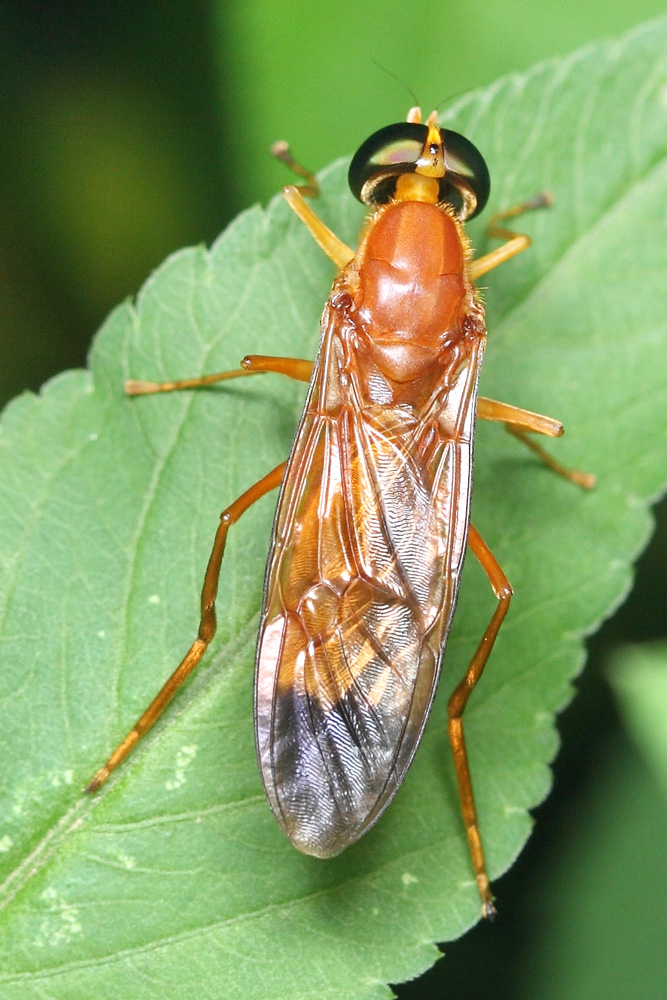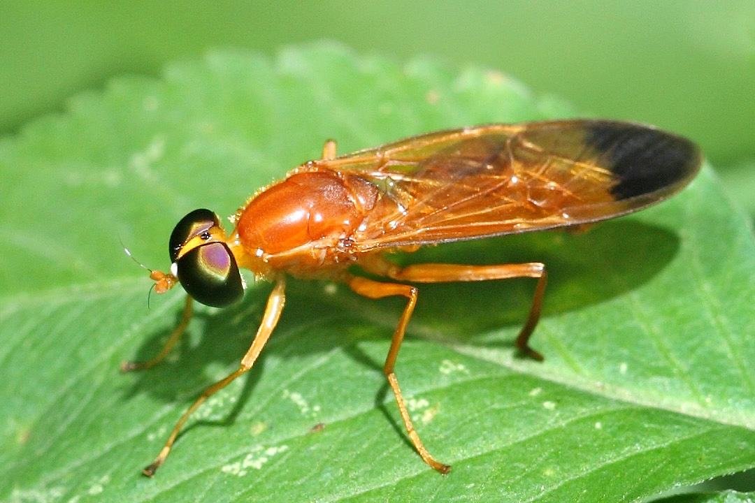 金黄指突水虻成虫体长22—25mm,通体金黄色,眼和腹部背面及翅端黑色,一副土豪金打扮。金黄指突水虻具有很强的领域性行为,雄性金黄指突水虻常停留在粪堆附近,宣示对粪便的占有权,驱赶其他雄性个体,同时等待雌性水虻的光临。但金黄指突水虻成虫并不吃粪便,吃的是花蜜,占领粪便是为了与被粪便吸引前来