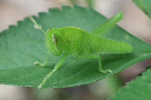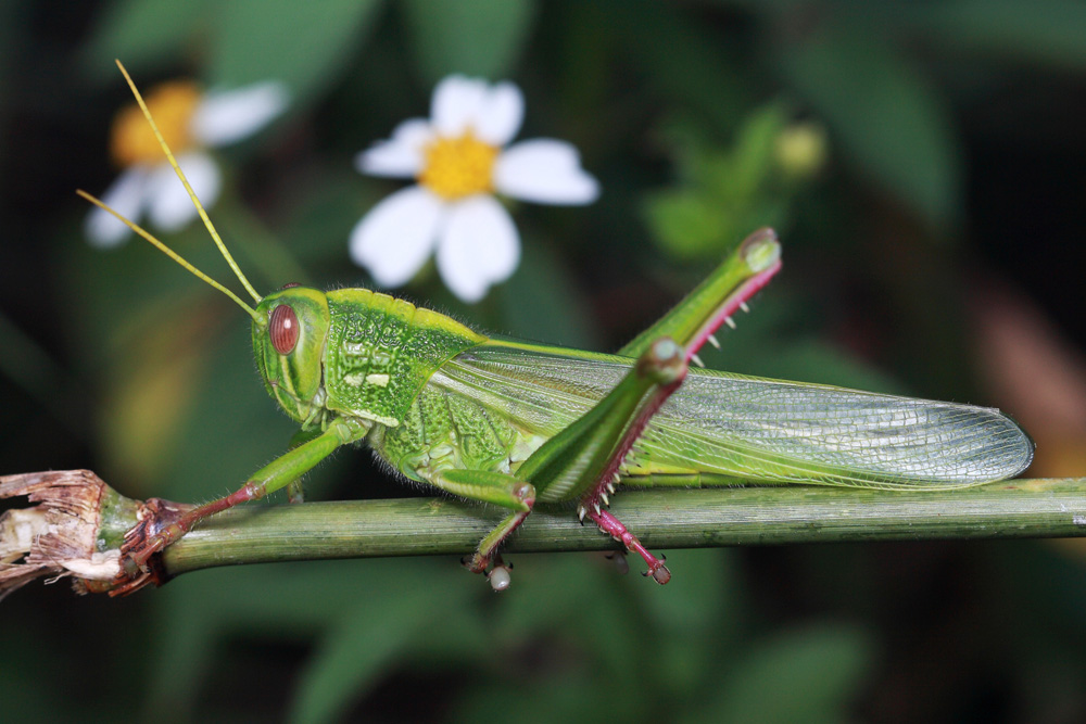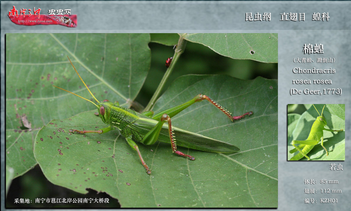 棉蝗又名大青蝗、蹬倒山,通体黄绿色,雄虫体长平均50-70mm,是国内最常见的大型蝗虫之一。它后腿强壮并长有尖刺,蹬拽有力,因此捕捉这种蝗虫要十分小心,避免手指被它踢伤。棉蝗为植食性昆虫,且食性广泛,对农作物有一定危害。棉蝗虽然身高体壮,但并不活跃,不喜欢扎堆,因而没有明显的群聚及迁飞为害习性。由于棉蝗含肉比例高,繁殖快,在人工养殖条件下成活率较高,国内已有不少人进行养殖,并开始进入我们的餐桌。